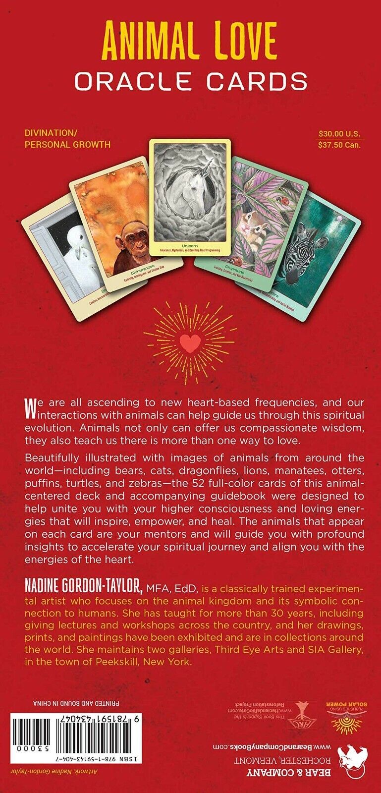 Mes visi kylame į naujus širdies dažnius, o mūsų bendravimas su gyvūnais gali padėti mums išgyventi šią dvasinę evoliuciją. Gyvūnai ne tik gali suteikti mums užuojautos išmintį, bet ir išmokyti mus, kad yra daugiau nei vienas būdas mylėti. Gražiai iliustruotos viso pasaulio gyvūnų, įskaitant meškas, kates, drakonus, liūtus, lamantinus, ūdras, pūkus, vėžlius ir zebrus, atvaizdais. 52 spalvotos šios į gyvūnus orientuotos kaladės kortos buvo sukurtos taip, kad rezonuotų su gyvūnų išmintimi ir visuotine meile. Kiekvienoje kortelėje pavaizduoti gyvūnai yra jūsų globėjai ir padės jums giliai suprasti, kaip paspartinti savo kelionę ir suderinti save su širdies energijomis. Dirbdami su kortomis pereisite per atsivėrimą, sujungiantį jus su aukštesne sąmone ir naujomis meilės energijomis, kurios įkvėps, suteiks jėgų ir išgydys. Kaladėje yra 50 gyvūnų kortų ir 2 laukinės kortos, kuriose vaizduojamos mitologinės būtybės: undinė ir vienaragis.