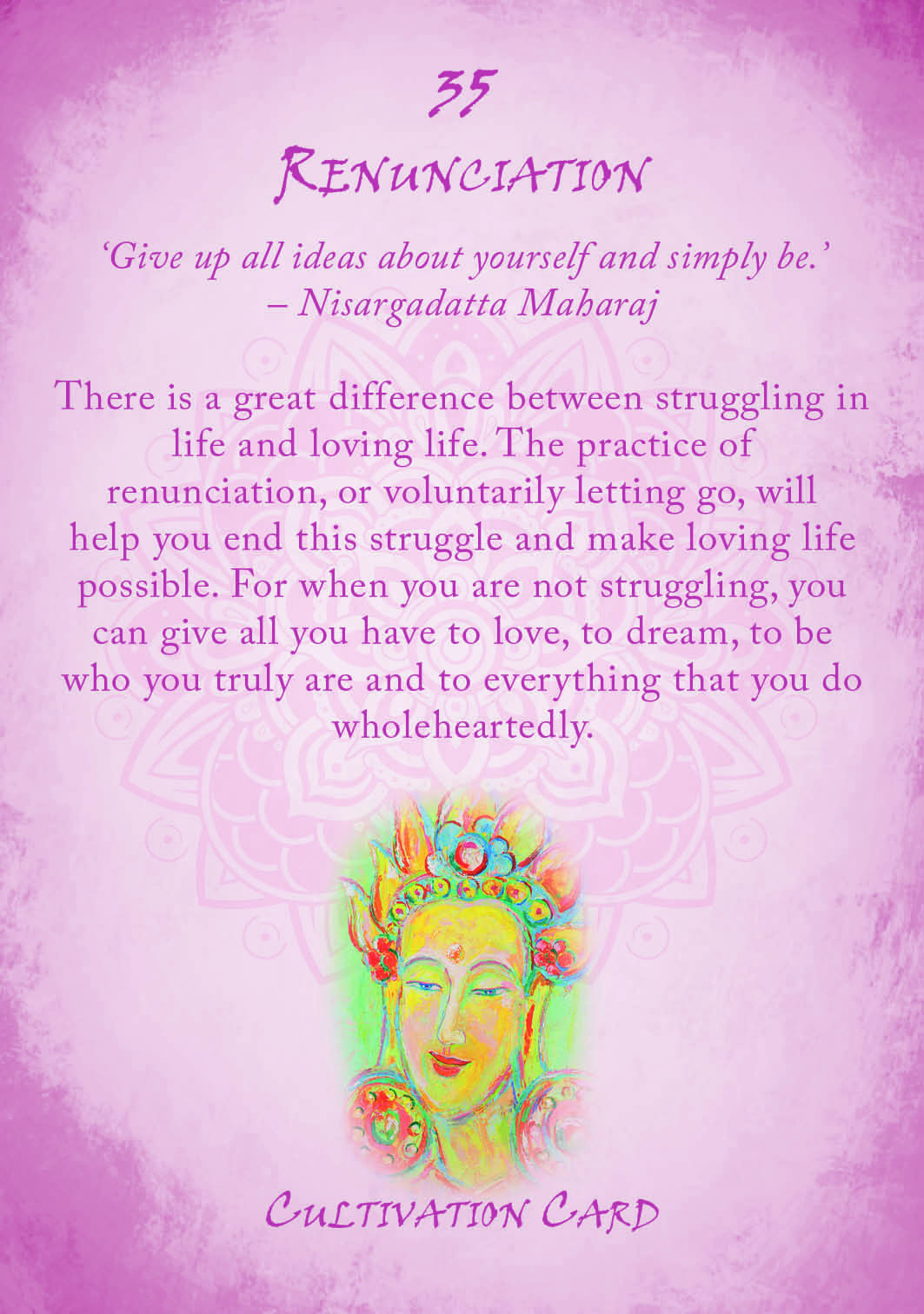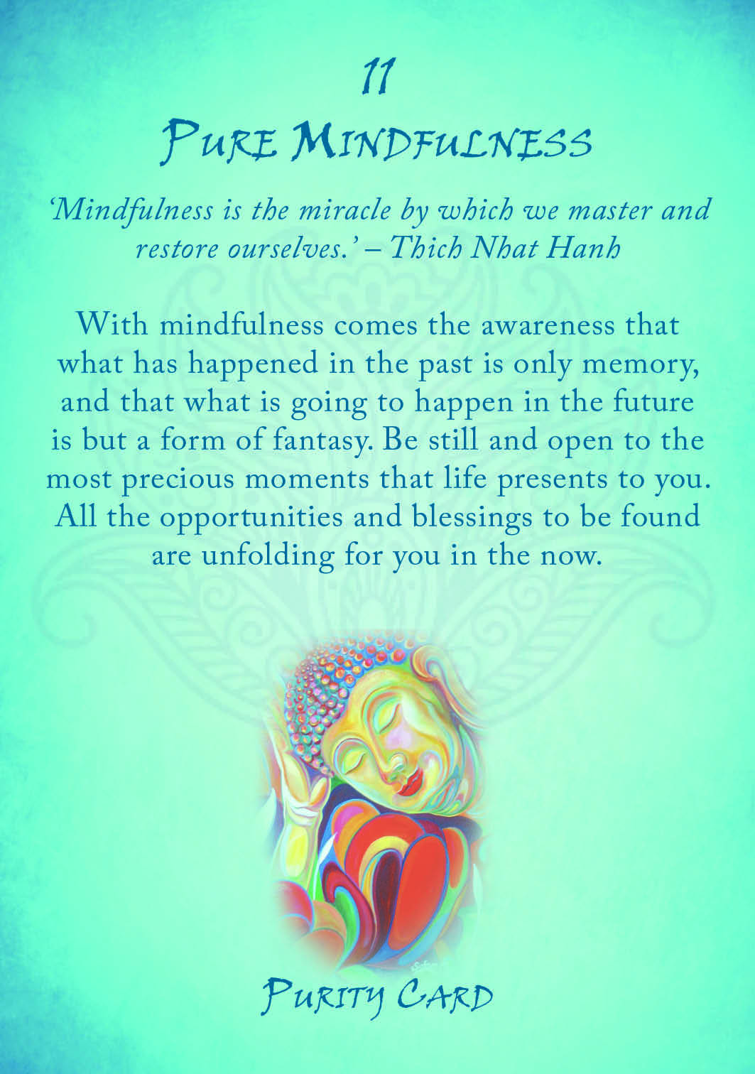 “Buddhism Oracle” kortos -tai lengvas įvadas į budizmo pagrindus. Kiekviena kortelė atspindi vieną iš pagrindinių budizmo principų. Kortomis paprasta naudotis, jose slypi išmintis, kuri tarsi šviesos blyksnis į jūsų gyvenimą atneša išgydymą, kryptį ir įkvėpimą. Ramus Budos atvaizdas padeda išminčiai lengvai sklisti, švelniai įsiskverbti į jūsų protą ir dvasią. Pasirinkę kortą, su kuria jaučiate stipriausią ryšį, galite lengvai atverti kelią pozityviam bendravimui su savo pasąmone. Pamatysite, kad kortos nušviečia situacijas nauja šviesa, sužadindamos vidinius sprendimus, kurie lengvai ateina iš energijos, kūrybiškumo ir intelekto, esančių jūsų viduje. Iš viso kaladę sudaro 36 kortos, kurios yra suskirstytos į keturis skyrius: tiesos, tyrumo, kontempliacijos ir tobulėjimo.