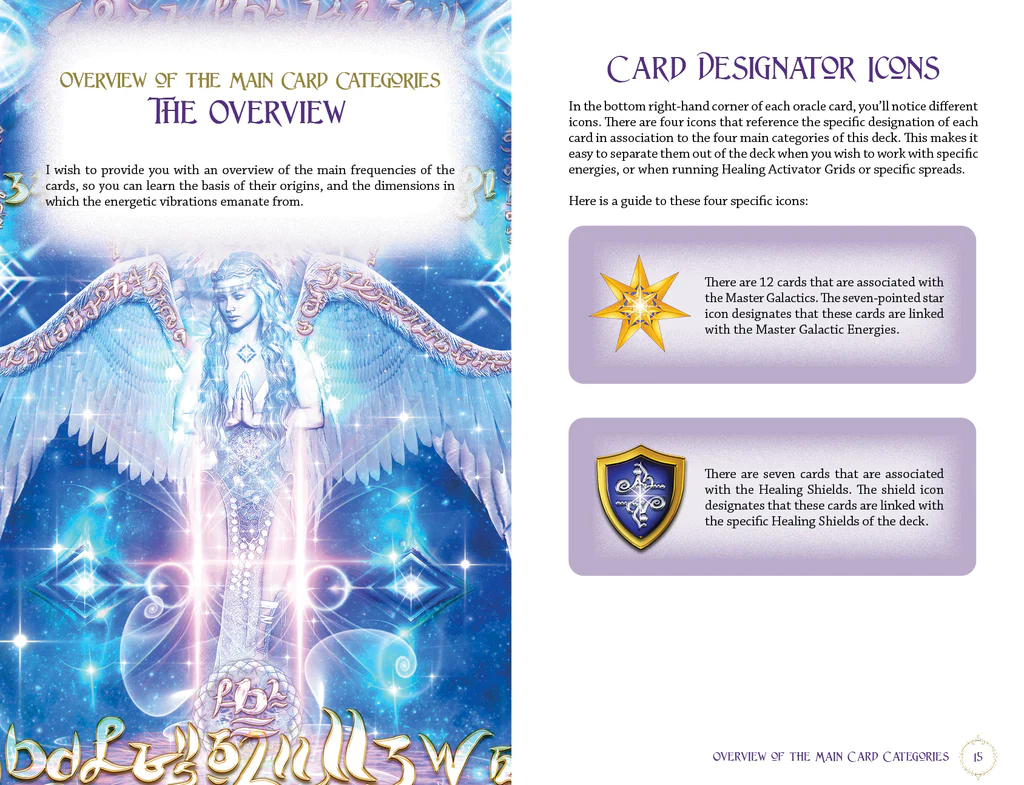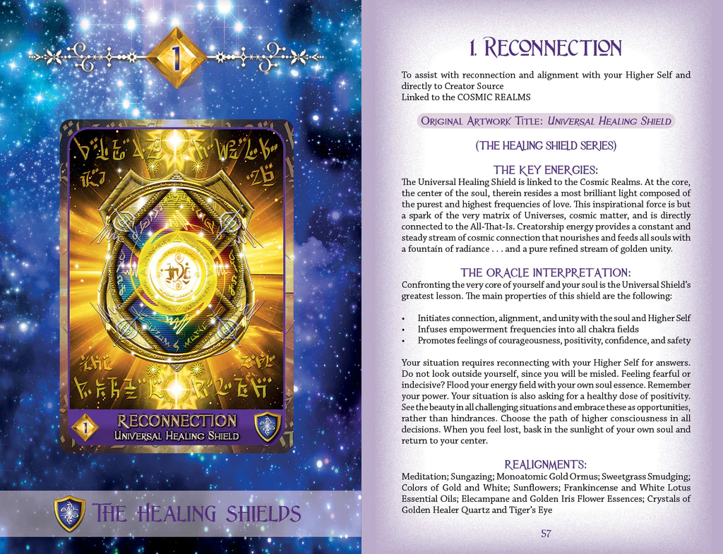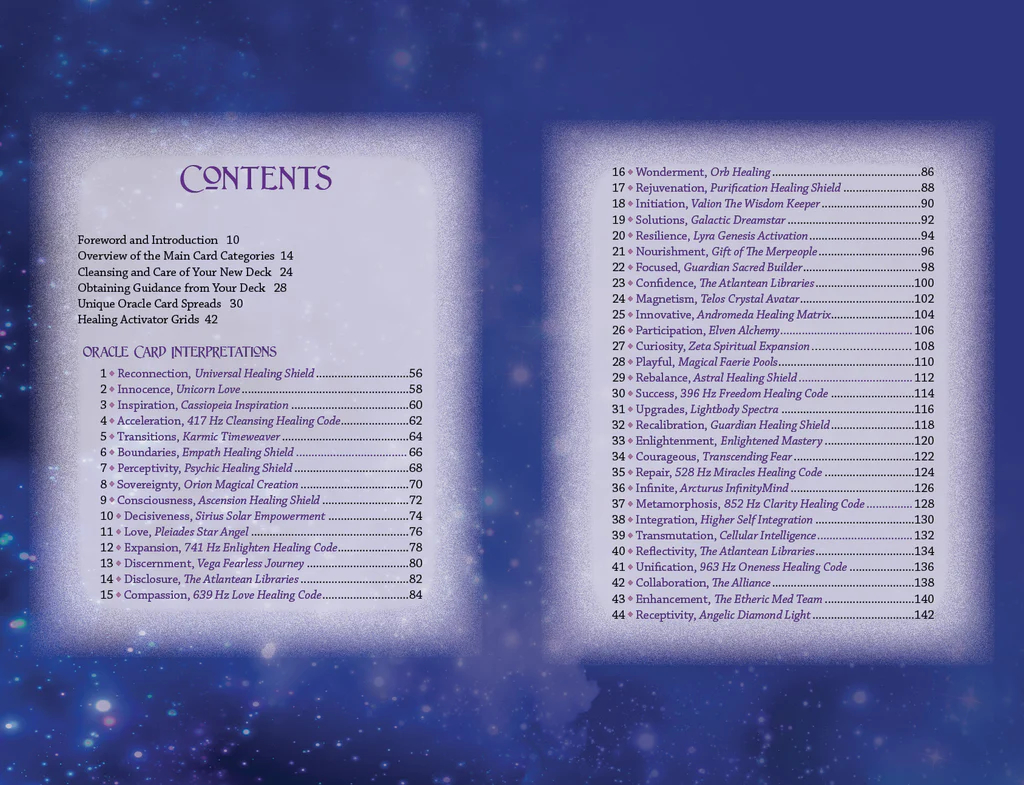 Su šia įkvėpta kortų kalade sustiprinkite savo ryšius su kosmosu ir gaukite galingų nurodymų, gydymo ir intuityvių įžvalgų tiesiai iš dangaus sferų. Įsiskverbę į dieviškuosius šių 44 orakulų kortelių šviesos kodų dažnius, nuostabiai sukursite kelią į savęs stiprinimą. Šioje kaladėje yra septyni naujoviški gydomieji skydai ir septyni gydomieji kodai, padedantys eksponentiškai pakelti vibraciją iki aukštesnės oktavos. Išmoksite dvasiškai iššifruoti šviesa pagrįstas energijas, sustiprinsite daugiamatį bendravimą ir inicijuosite teigiamas gydomąsias vibracijas, skatinančias gerovę. Apima septynis unikalius kortelių išskleidimo pasiūlymus ir keturis galingus gydomųjų aktyvatorių tinklelius. Naudokite šią įkvepiančią kaladę asmeniniam intuityviam vadovavimui, gydymo aktyvinimui, klientų skaitymui ir energingam atnaujinimui arba kaip patvirtinimo korteles. Išplėskite savo sąmoningumą daugiau, nei kada nors svajojote!