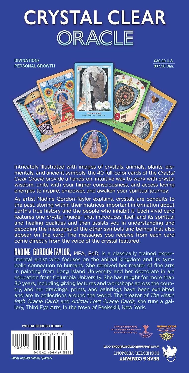 Įmantriai iliustruotos kristalų, gyvūnų, augalų, elementalų ir senovės simbolių atvaizdais, 40 spalvotų “Crystal Clear Oracle” kortų suteikia praktinį, intuityvų būdą dirbti su kristalų išmintimi, susijungti su aukštesniąja sąmone ir naudotis meilės energijomis, kad įkvėptumėte, sustiprintumėte ir pažadintumėte savo dvasinę kelionę. Ši kaladė sukurta siekiant padėti jums suaktyvinti ir suderinti save su šventomis aukštesnių sąmonės dažnių geometrijomis, leidžia jums susijungti su savo aukštesniuoju “aš” ir paleisti tai, kas jums nebetarnauja. Pasirinkę kortą iš šios kaladės, intuityviai gausite tai, kas šiuo metu jums tinka. Dirbdami su šiomis kortomis ir kristalų vedliais, jūs atgaivinate intuityvų senovės žmonių žinojimą, nes esate laikomi Dieviškosios meilės širdyje.