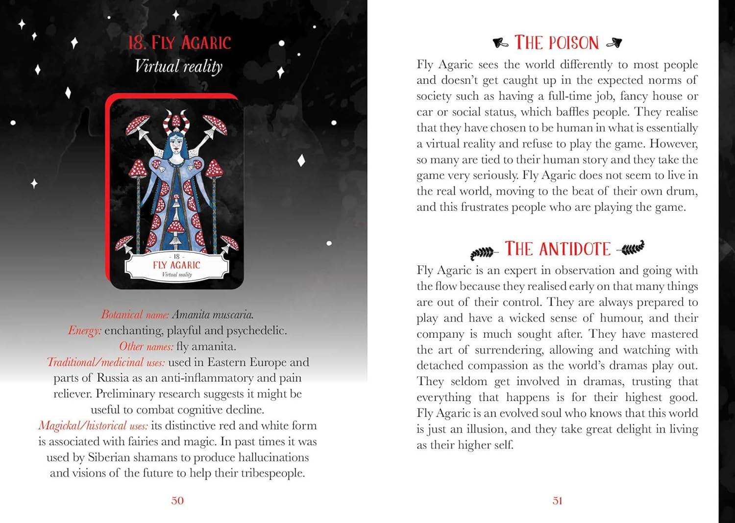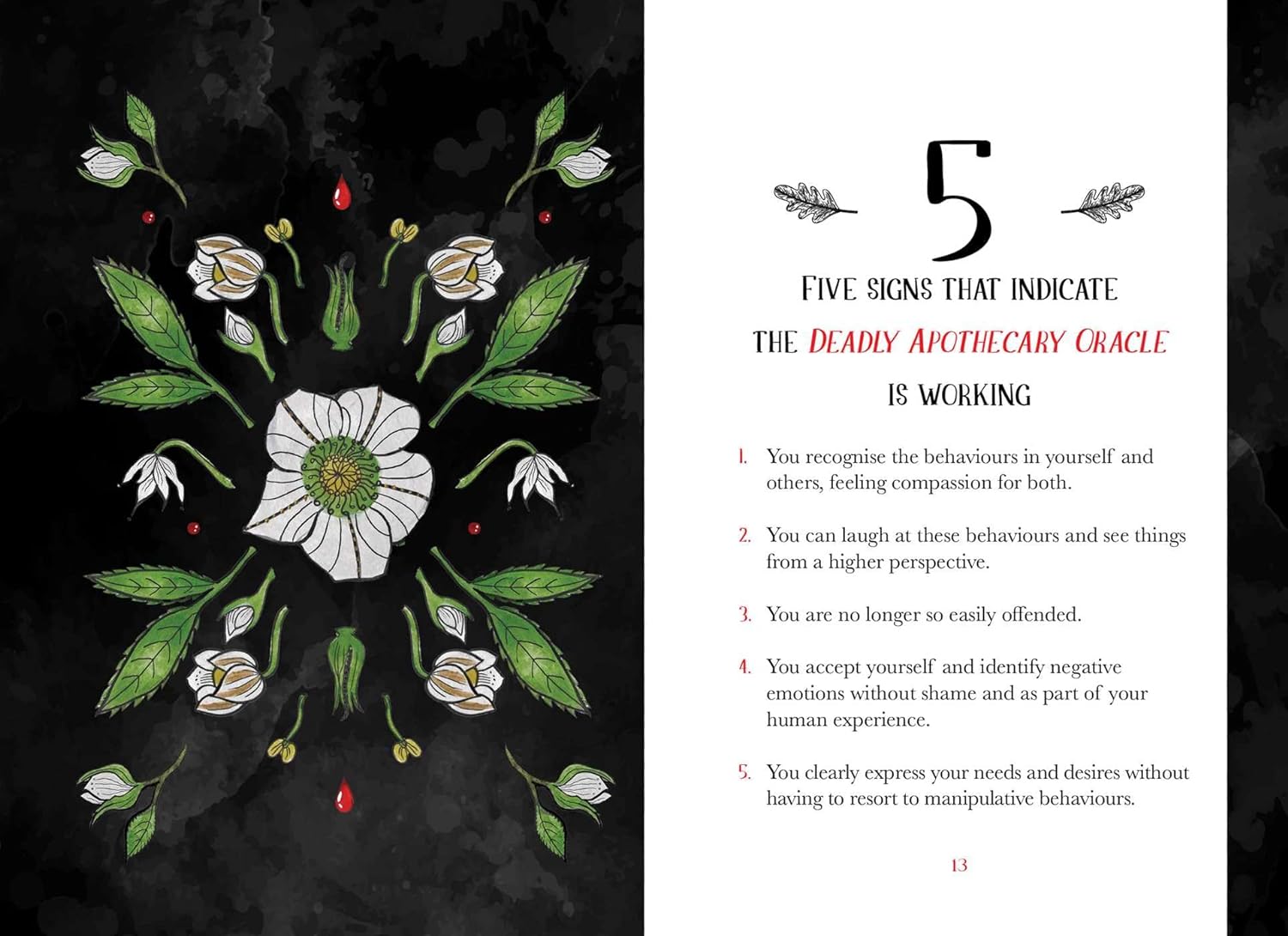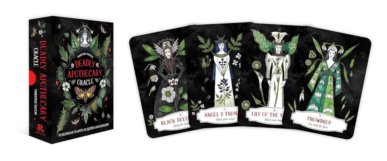 Susipažinkite su viso pasaulio nuodingų augalų magiškomis ir gydomosiomis savybėmis. Paaiškėja, kad labiausiai istorijoje smerkiami augalai yra neįtikėtini vaistai. Orakule “Deadly Apothecary” atraskite jų naudą energetiniu lygmeniu. Šie botaniniai augalai veikia labai galingai, o kaip ir šie augalai, taip pat galingai veikia ir stiprios emocijos, kurias jaučiame kaip žmonės – tos, kurias stengiamės slėpti. Tiesą sakant, darbas su šiomis emocijomis gali būti vienas didžiausių mūsų vaistų. Priimti savo šešėlines puses nėra kelionė silpnoms širdims. Įsiklausykite į nuodų šventikės kvietimą ir keliaukite su ja per šviesą ir tamsą. Jei tai padarysite, gausite daugybę įžvalgų. Tegul jos padeda jums priimti visas savo dalis.