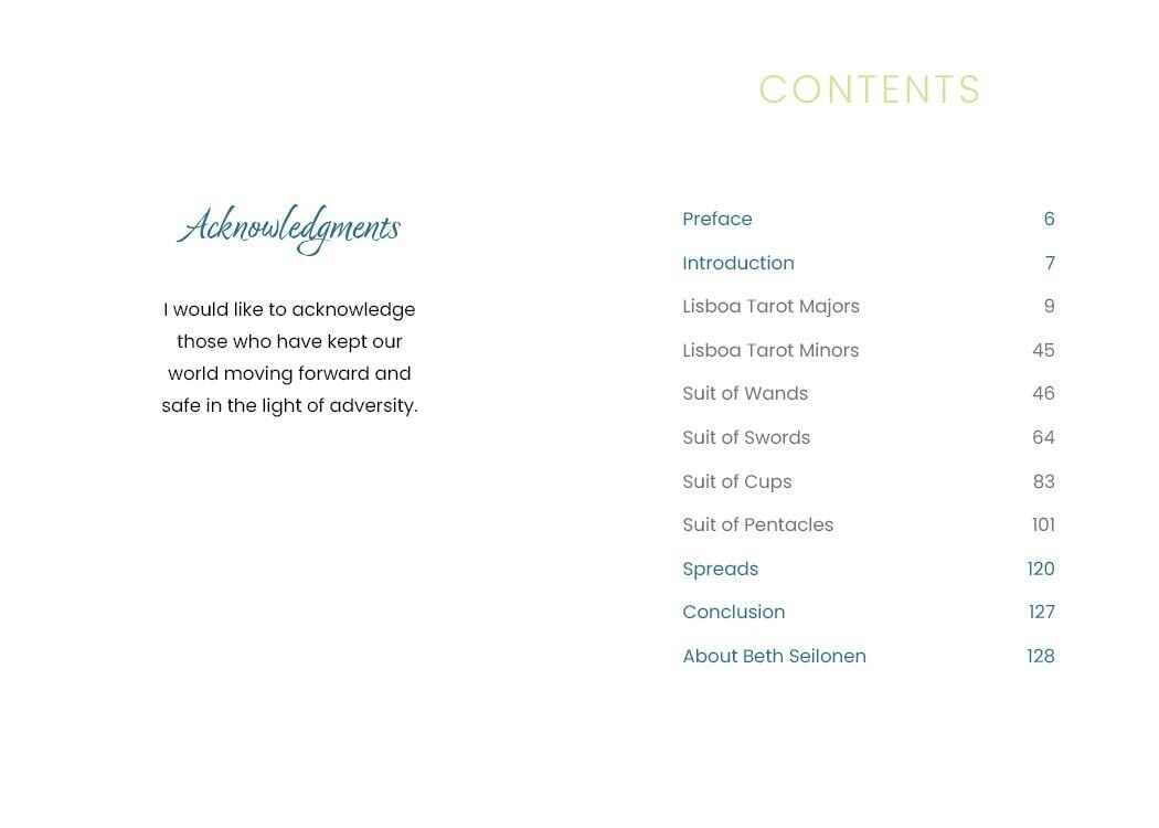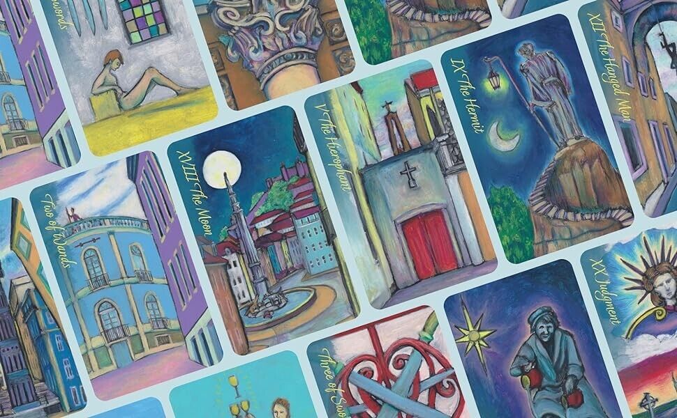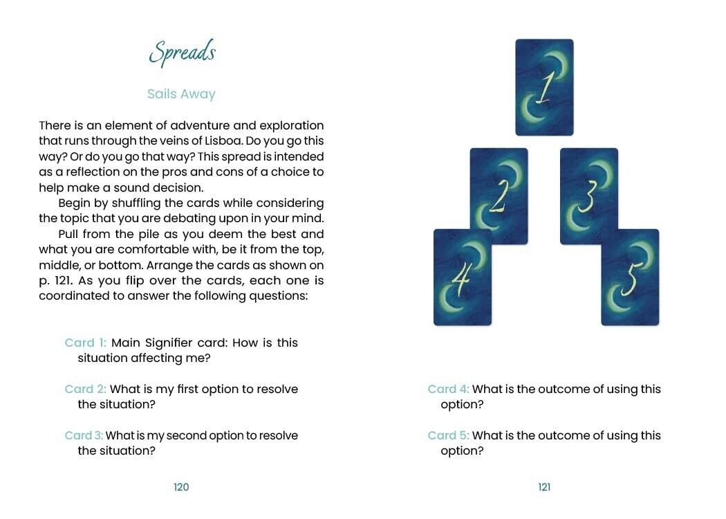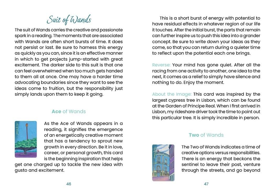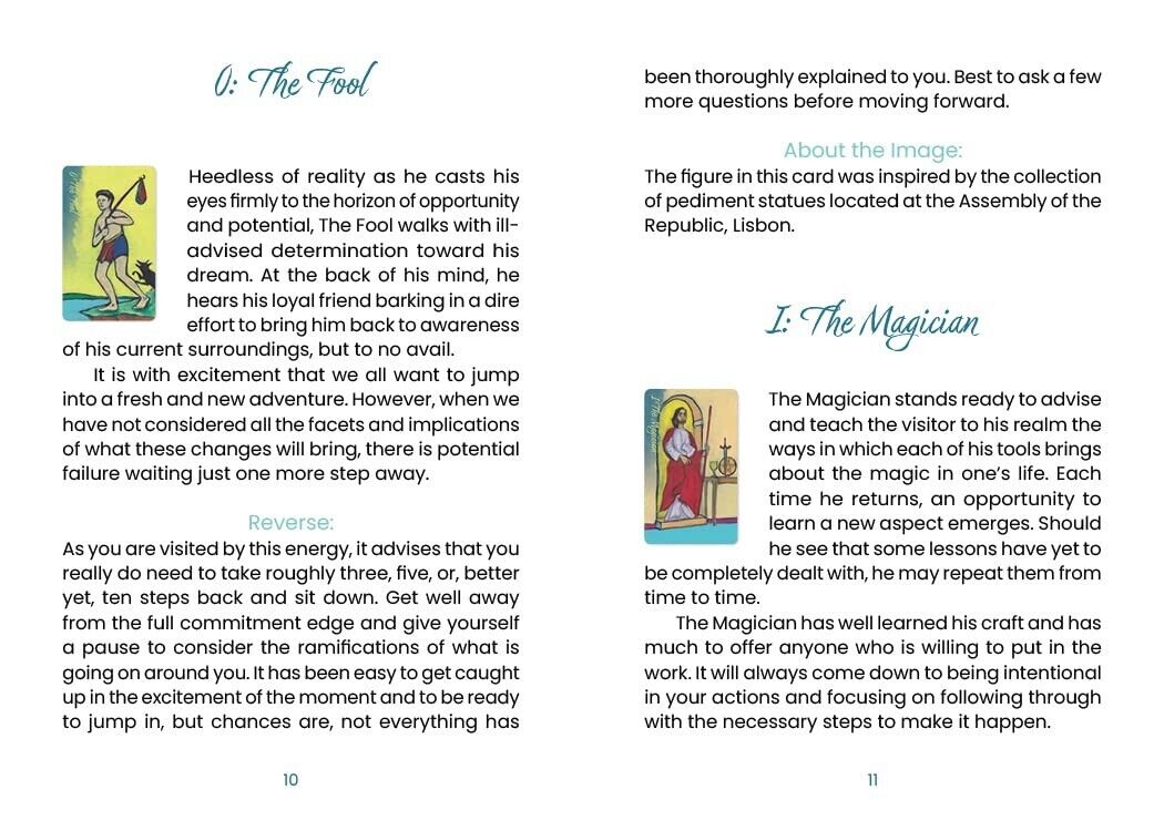 Skaitytojai vežami į magiškas Lisabonos (Portugalijos) gatves savęs atradimo link. Lisabonos Taro atveria naujus kelius su energija ir prisiminimais, kurie prieš daugelį metų buvo iškalti akmenyje ir išlieti į metalą, laukiantys, kol vėl bus išgirsti. Paprastas kortų maišymas ir sargybinių statulų bei ryškių vietų išmintis, sklindanti iš postimpresionistinio stiliaus kortelių vaizdų. Gražios rankomis pieštos iliustracijos paskatins skaityti ir mąstyti, atspindėdamos senojo pasaulio Europos miestą iš tiesioginio gyvenimo stebėjimo, nes jis susijęs su kasdiene patirtimi.