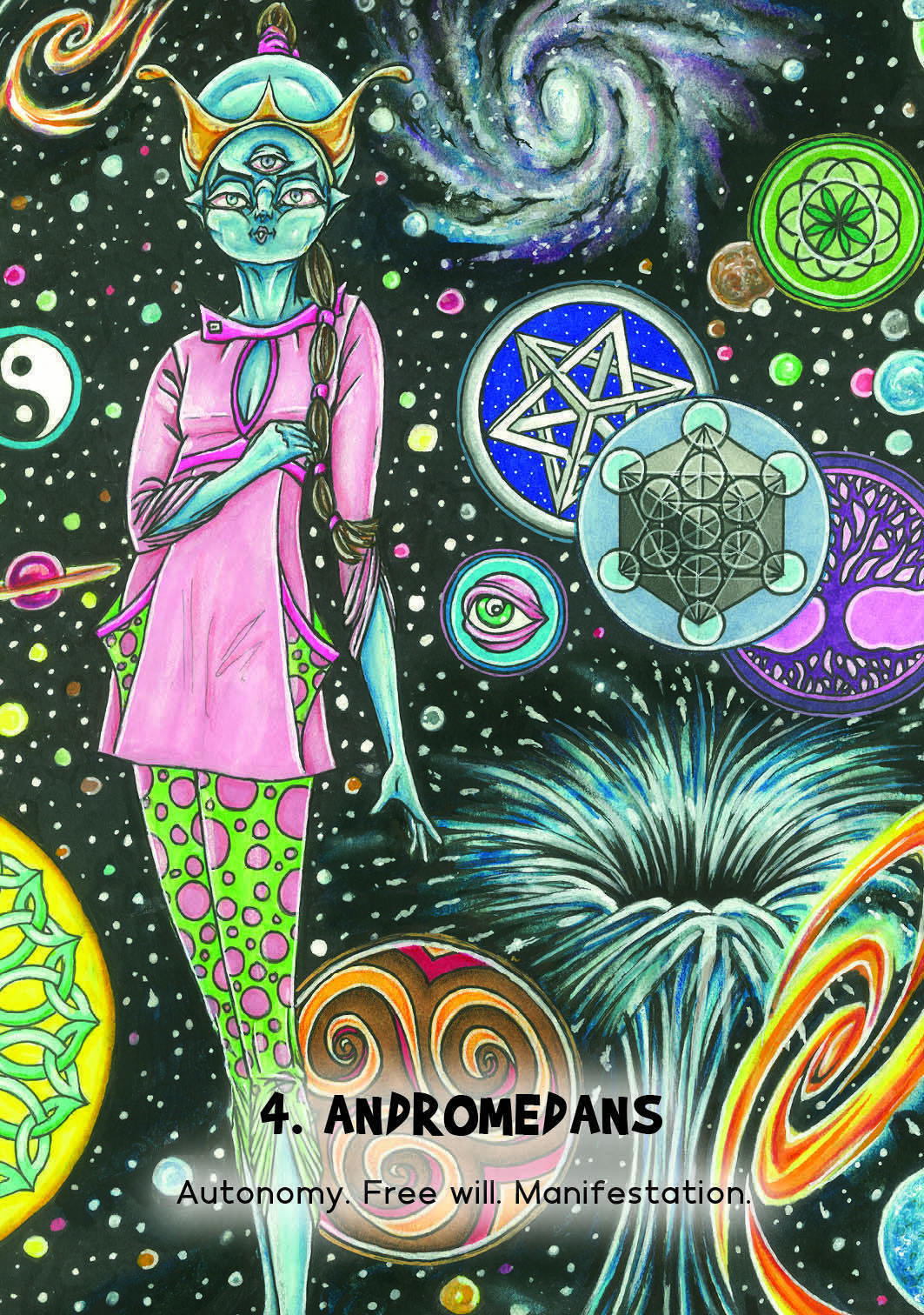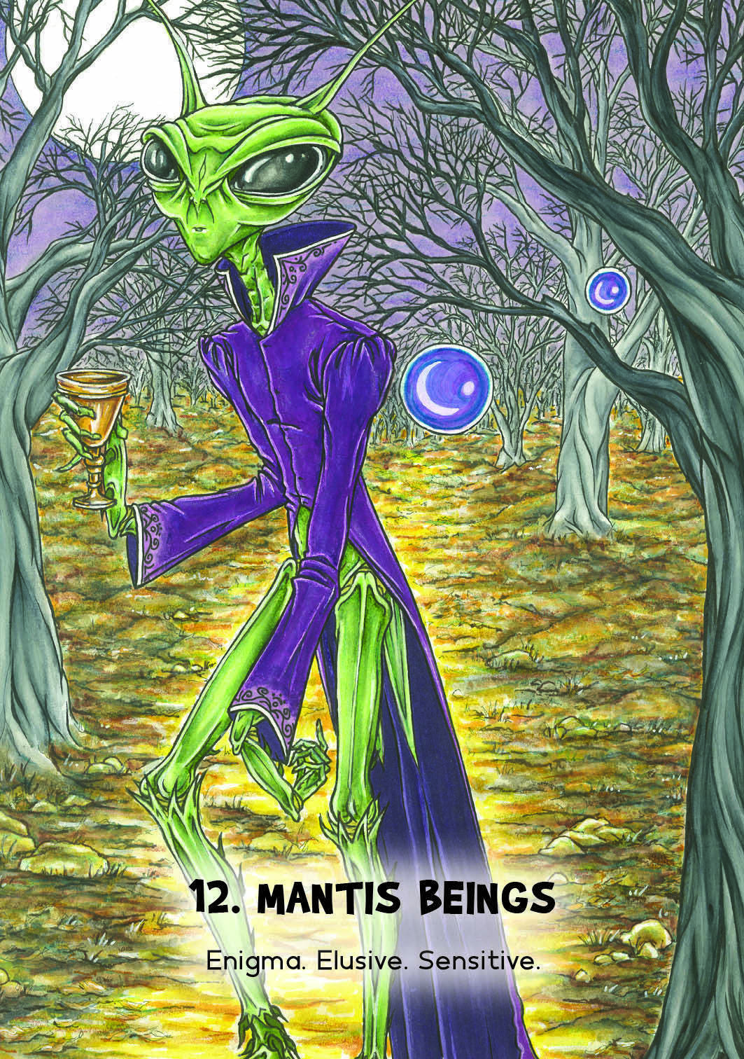 Mes visi esame kosminių žvaigždžių sėklos, gimusios iš stebuklų, kurie yra už nepaprastų dalykų, tikimės visiškai pabusti mūsų sąmoningoje nušvitusioje visatoje. Didieji dangaus dievai tyliai lankėsi ir stebėjo žemiečius nuo pat laikų pradžios. Ši kortų kaladė sukurta ir skirta kaip gairės nežemiškoms rūšims, kurios peržengia žmogaus ir genetinio proto ribas ir egzistuoja kartu. Kiekviena korta yra gražiai sukurta kaip simbolinis ir reprezentacinis kanalas tam tikram archetipui ir turi raktinius žodžius, apimančius metafizinius, emocinius ir psichologinius jausmus bei kasdienes praktines reikšmes. Platus ateivių asortimentas yra neaprėpiamas, daugiasluoksnis ir net kartais sudėtingas. Jie atidžiai stebi mus individualiai ir kartu. Jie stebi mūsų sėkmes ir nesėkmes, ir viską, kas yra tarp jų. Atverkite akis ir išplėskite savo įžvalgą į daug platesnius horizontus ir leiskite šiems Didiesiems dangaus dievams perteikti savo išmintingus nurodymus ir išmintį iš daugiamačio suvokimo. Pasitikite senovės dangaus būtybes, kurios amžinai jus stebi.