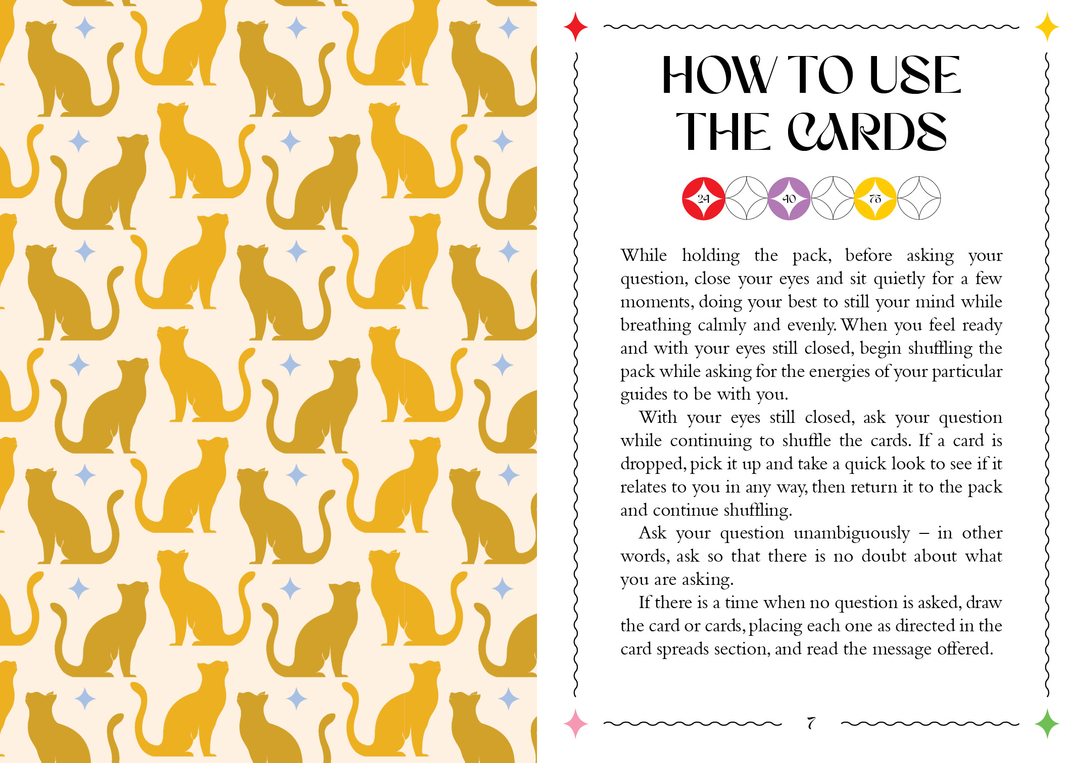 Naudojantis šiomis kortomis ir tyliai susitelkus į savo klausimą, jūsų energija vibruos į pasirinktas kortas ir atskleis jų dvasines žinutes.