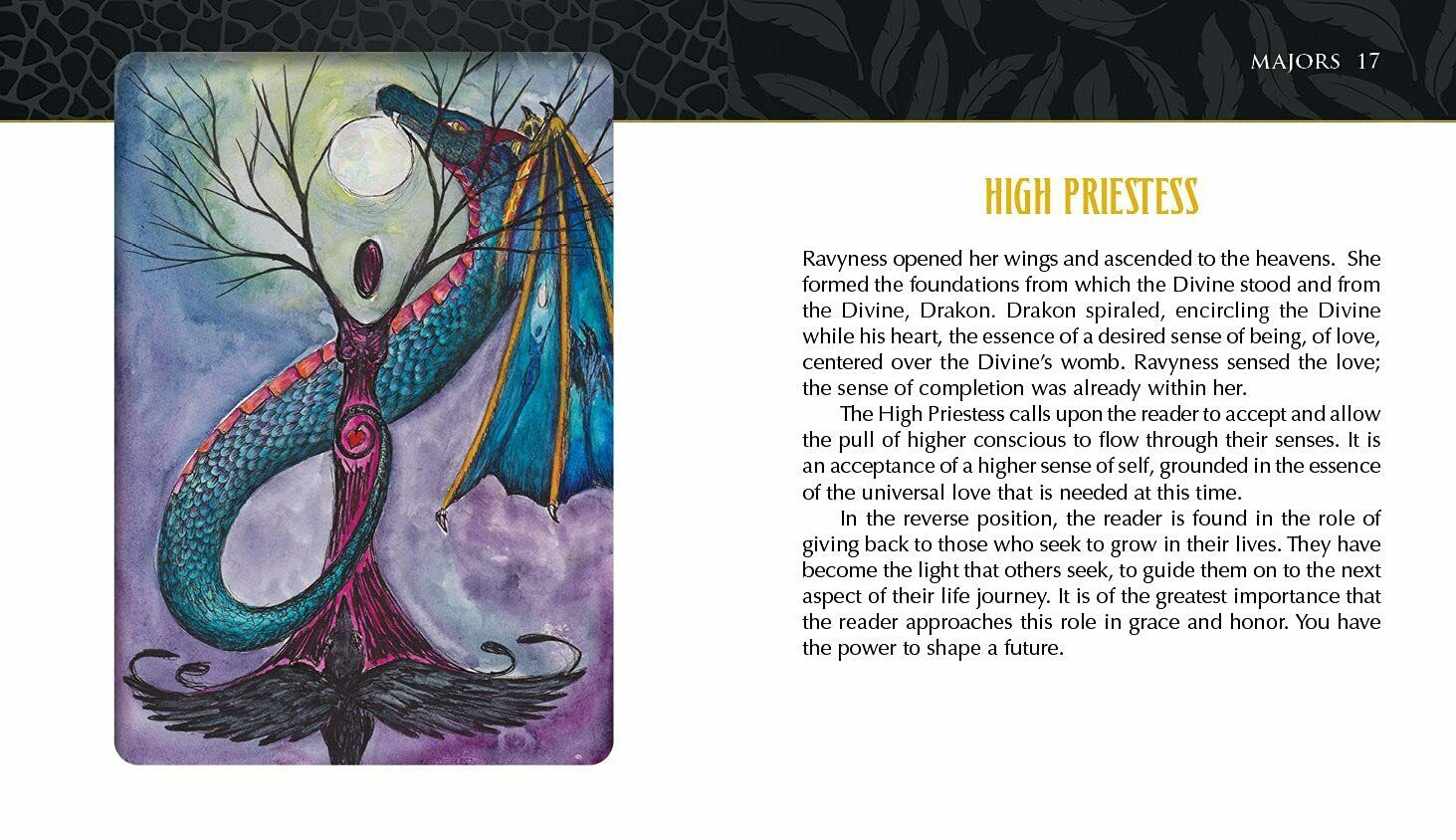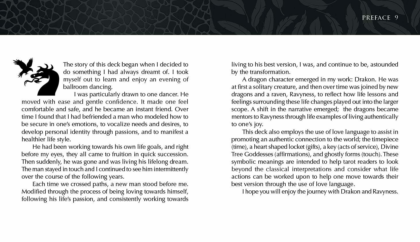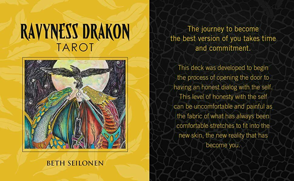 Kartais žmonės patenka į mūsų gyvenimą. Kartais jie atskrenda ant drakono sparno. Tai mažai tikėtinos poros, varno ir drakono, turinčios savo gyvenimus ir savo tikslus, kurie nuolat traukia vienas prie kito, meilės istorija. Per pakilimus ir nuosmukius, kuriuos patiria bet kuri pora iš labai skirtingų pasaulių, jų istorija įrodo, kad bet kuris padaras, kuris gali išgyventi sunkius laikus, siekdamas gyvenimo tikslų ir mylėti save ir kitus. Ši fantastiška 78 kortų kaladė puikiai iliustruoja, kaip suvokimas tiek šviesiųjų, tiek tamsiųjų savęs komponentų ir jų įtakos mūsų gyvenimui gali įgalinti žmogų planuoti tobulėjimą ir augimą. Stebėkite Ravynessą ir Drakoną jų Taro kelionėje, kai jie atspindi ir duoda švelnų, palaikantį stumtelėjimą vienas kitam, kad taptų savo aukštesniuoju „aš“. Kontekstas ir siužeto linija lengvai susijungia su žmogiškąja patirtimi, skatindama santykių augimą ir asmeninį augimą. Įkvėptas kūrėjos, kaip mokytojos, darbo ir jos dalyvavimo visoje šalyje vykstančiame judėjime, siekiant parodyti aukštųjų mokyklų moksleiviams, kaip sveikai rinktis savo ateitį.