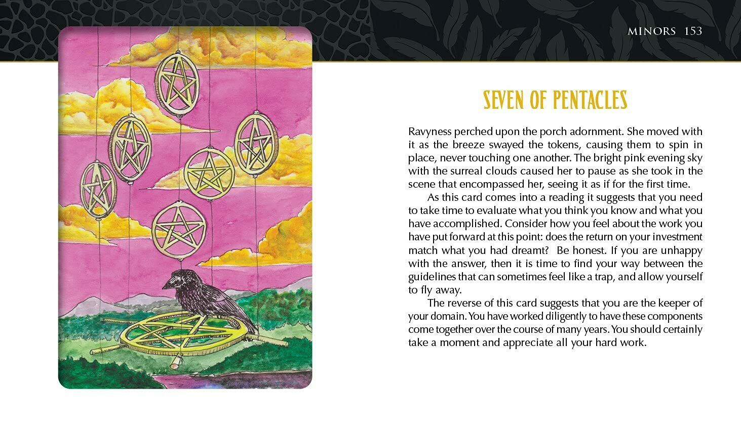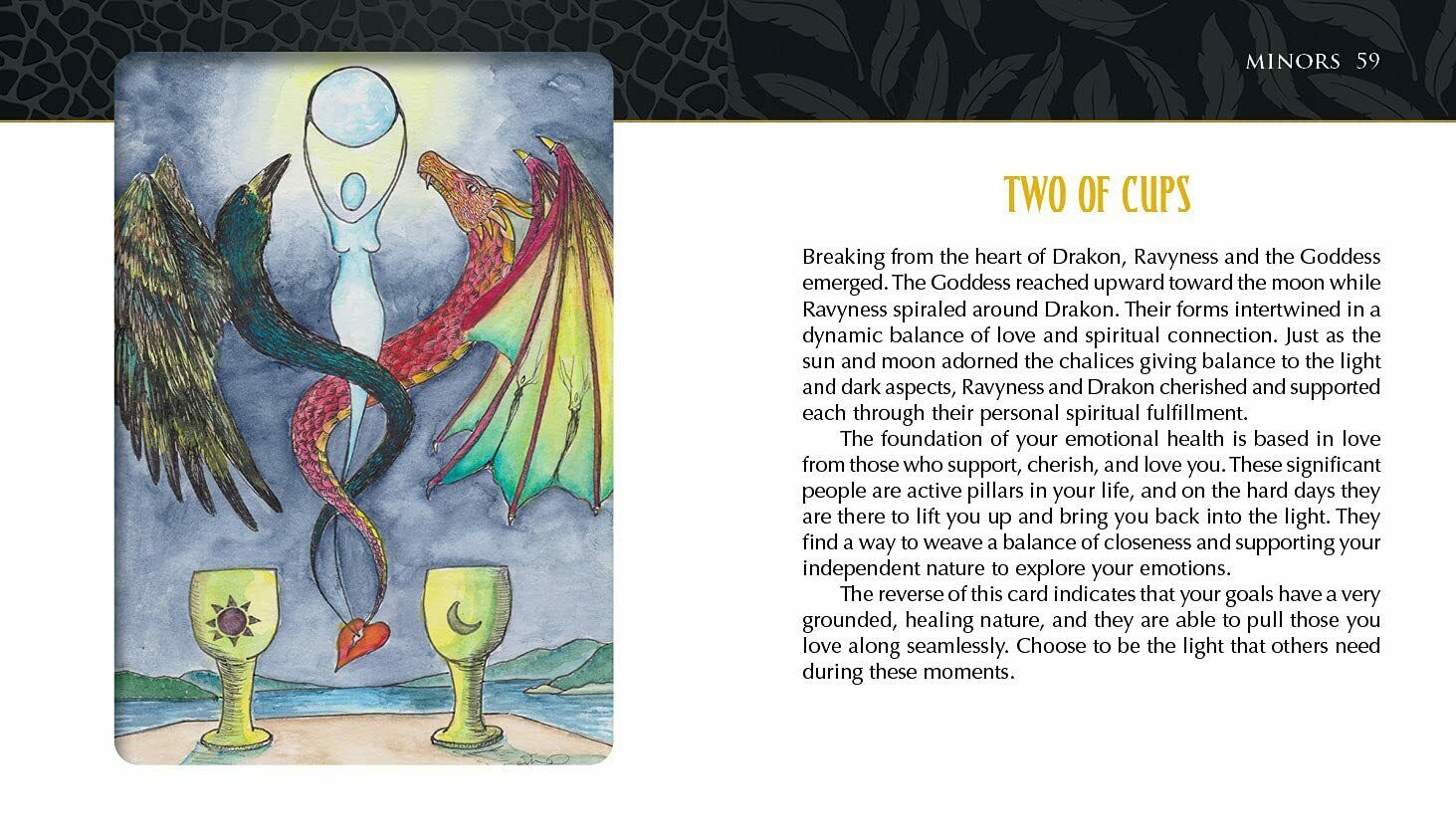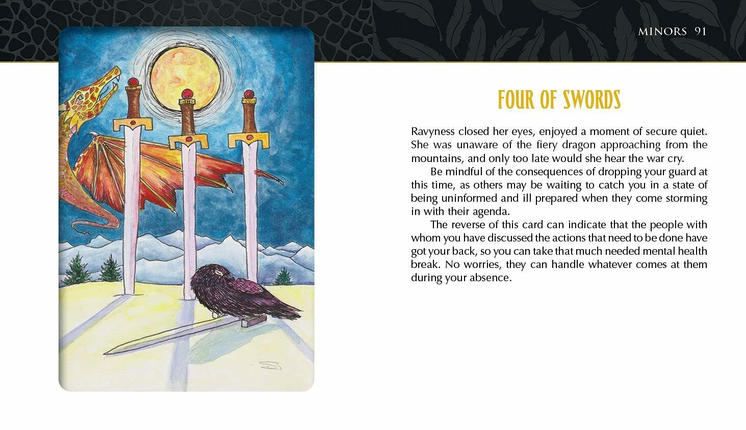 Kartais žmonės patenka į mūsų gyvenimą. Kartais jie atskrenda ant drakono sparno. Tai mažai tikėtinos poros, varno ir drakono, turinčios savo gyvenimus ir savo tikslus, kurie nuolat traukia vienas prie kito, meilės istorija. Per pakilimus ir nuosmukius, kuriuos patiria bet kuri pora iš labai skirtingų pasaulių, jų istorija įrodo, kad bet kuris padaras, kuris gali išgyventi sunkius laikus, siekdamas gyvenimo tikslų ir mylėti save ir kitus. Ši fantastiška 78 kortų kaladė puikiai iliustruoja, kaip suvokimas tiek šviesiųjų, tiek tamsiųjų savęs komponentų ir jų įtakos mūsų gyvenimui gali įgalinti žmogų planuoti tobulėjimą ir augimą. Stebėkite Ravynessą ir Drakoną jų Taro kelionėje, kai jie atspindi ir duoda švelnų, palaikantį stumtelėjimą vienas kitam, kad taptų savo aukštesniuoju „aš“. Kontekstas ir siužeto linija lengvai susijungia su žmogiškąja patirtimi, skatindama santykių augimą ir asmeninį augimą. Įkvėptas kūrėjos, kaip mokytojos, darbo ir jos dalyvavimo visoje šalyje vykstančiame judėjime, siekiant parodyti aukštųjų mokyklų moksleiviams, kaip sveikai rinktis savo ateitį.