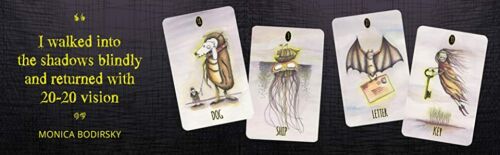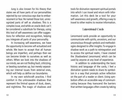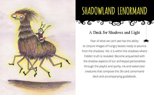 Baimė to, ko nematome, turi galimybę sukurti alkanų žvėrių, pasiruošusių išbristi iš šešėlių, vaizdus. Tačiau paslėpta tiesa atskleidžiama šešėlyje. Susipažinkite su mūsų archetipinių asmenybių šešėliniais aspektais per žaismingus ir savotiškus rašalu ir akvareles naudojančias būtybes, kurios sudaro šią 36 kortų Lenormand kaladę ir pridedamą vadovą. Pradedantiesiems, taip pat patyrusiems profesionaliems, Lenormand skaitytojams ir šešėliniams darbuotojams, šioje kaladėje naudojami tradiciniai „Petit Lenormand“ simboliai, siekiant pateikti vaizduotės sprendimus kasdieniams iššūkiams. Kūrybingiems ieškotojams, vykstantiems savęs atradimo kelionėje, ši kaladė yra veiksminga priemonė, leidžianti pasiekti paslėptas žinias ir suteikti jums daugiau galimybių, įskaitant įvadą į Lenormand kartomaniją, kortų reikšmes, apmąstymus ir klausimus. Jame yra lengvai sekamos sklaidos, kad galėtumėte atrasti, apmąstyti ir integruoti anksčiau nepripažintus savo gyvenimo ir asmenybės aspektus.