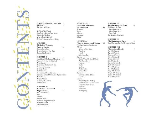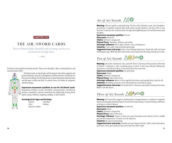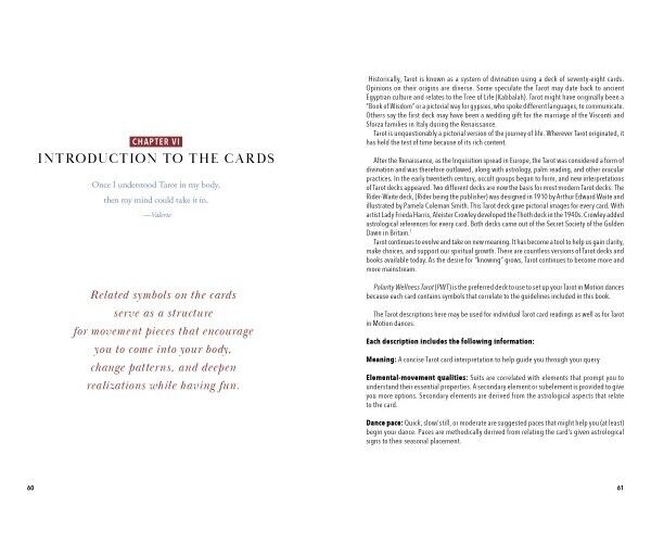 Norint pasveikti, reikia keistis, o norint pasikeisti – judėti. Žinote tą jausmą, kai atsipalaiduoji ir tada darai kažką unikalaus, visiškai nebūdingo. . . ir tai stebuklinga! Išmokite sukurti šias „aha“ akimirkas ir pažadinkite naujas mintis, kūrybiškumą ir aiškumo būseną naudodami „Tarot in Motion“. Procesas apgaulingai paprastas: sukurkite ketinimą, ištraukite Taro kortą ir sukurkite šokį. Žaismingu būdu derinant Taro kortų reikšmes ir judėjimą, galima pamatyti fizinio, psichinio ir emocinio lygio problemas ir pradėti gydymą. Tegul šis vadovas yra jūsų savarankiško Taro judėjimo vadovas ir grupinių savęs atradimo seansų, glaustų kortų interpretacijų, sąsajų su čakromis ir astrologinėmis kūno zonomis bei švenčių ritualų šventimo metodų vadovu.
