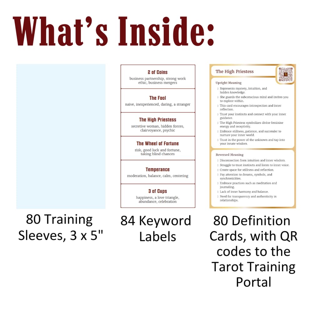 Išmokite Taro reikšmių be vargo naudodamiesi šia naujoviška trijų žingsnių interaktyvia mokymo programa. “Tarot Training Sleeves” – tai naujoviška trijų žingsnių mokymosi programa, kuri suteikia jums galimybę susipažinti su Taro reikšmėmis. Kaip naudotis: