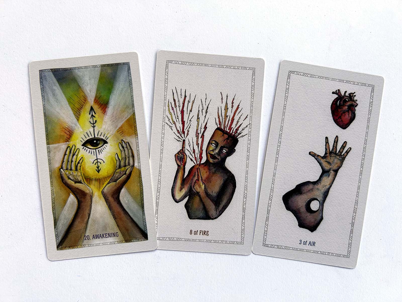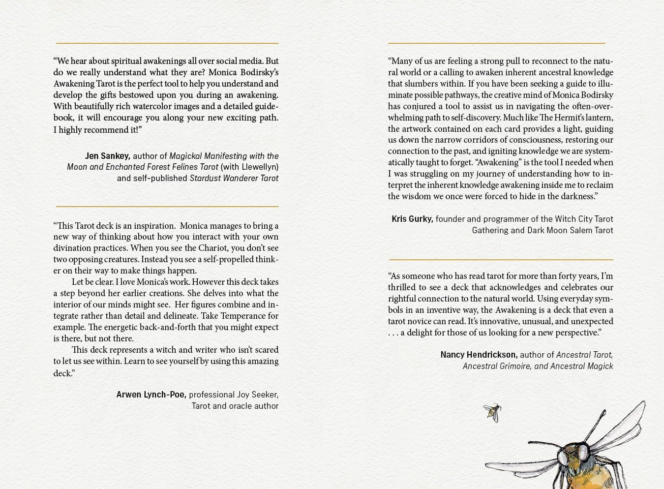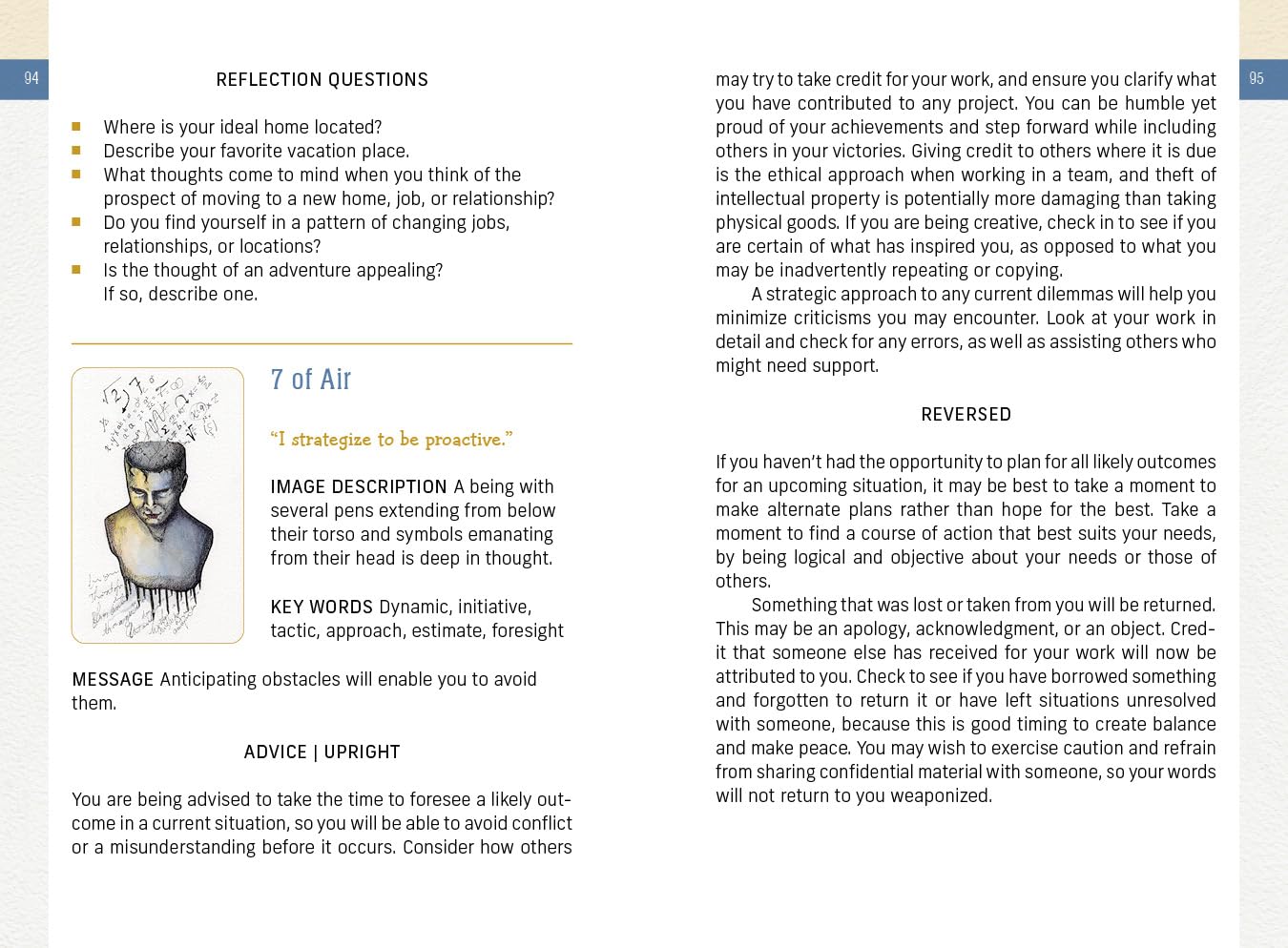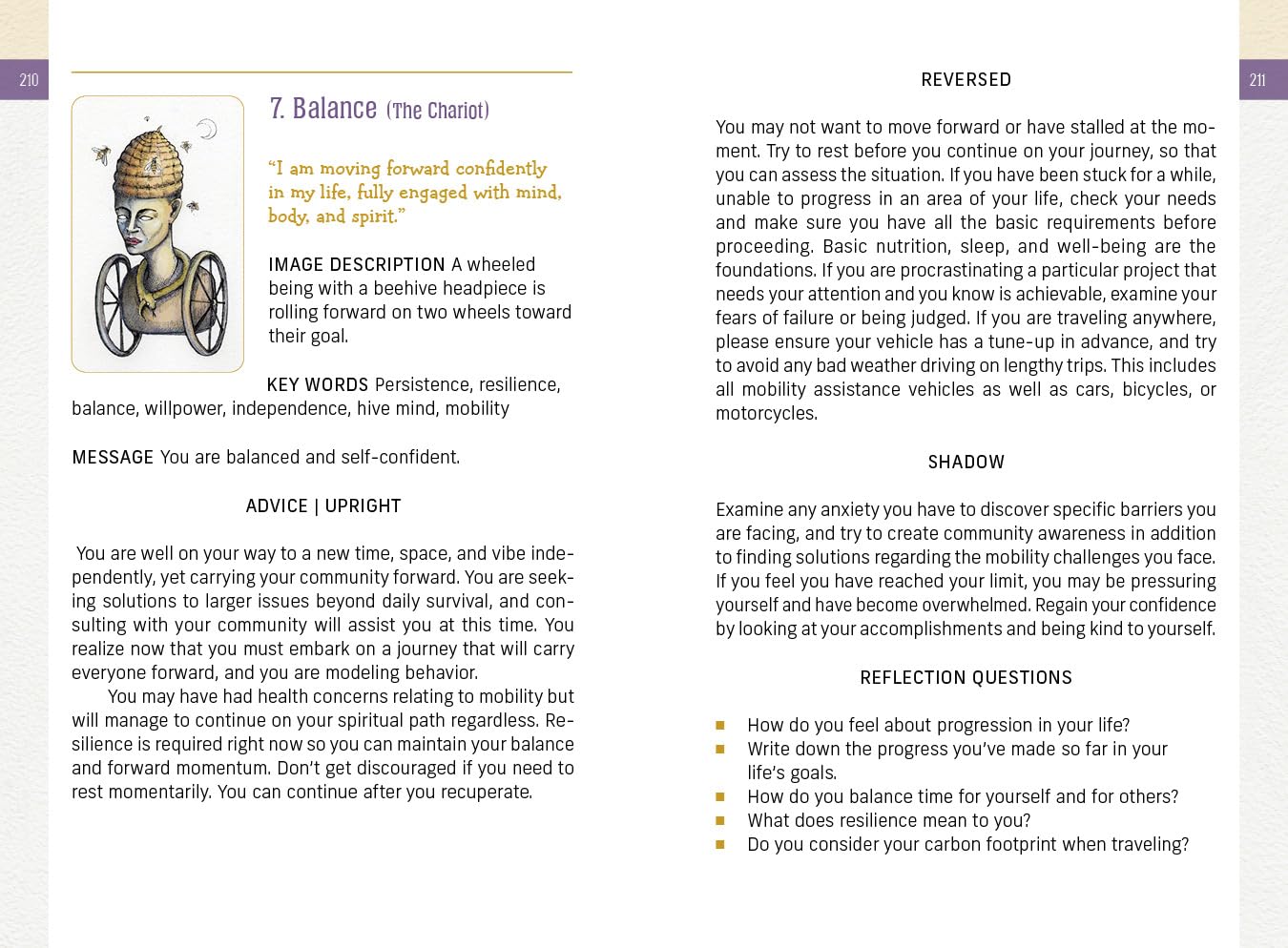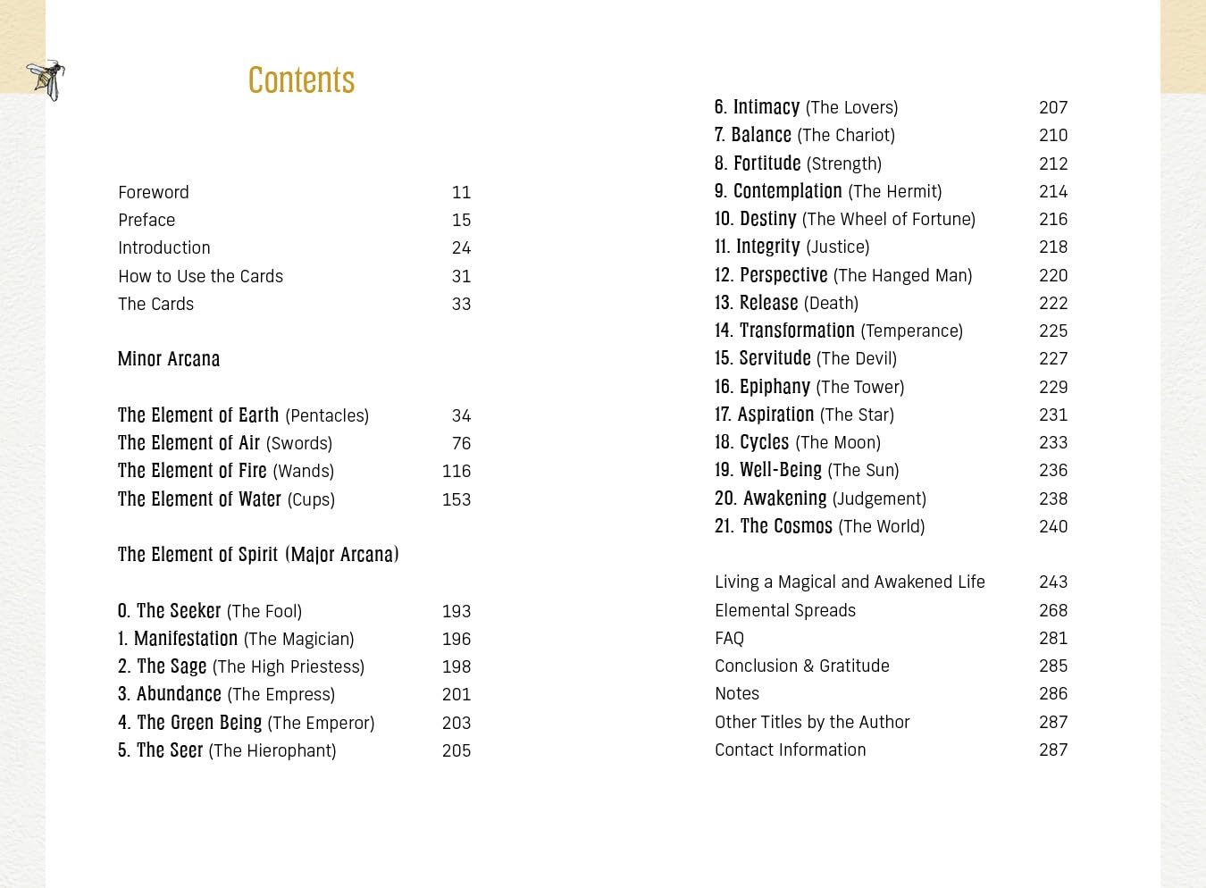 Kortelėse yra 78 svajingos tušo ir akvarelės iliustracijos, primenančios šviežią aštuntojo dešimtmečio meną. Knygoje gausu kortelių įžvalgų, skirtų stačiai, atvirkščiai ir šešėliams, raktiniais žodžiais ir susimąstyti skatinančiais klausimais, susijusiais su tokiomis temomis kaip stebuklingas gyvenimas, elementų pratimai ir tvarus gyvenimas. Pažadinkite tikrąjį save ir atraskite gyvenimo tikslą.