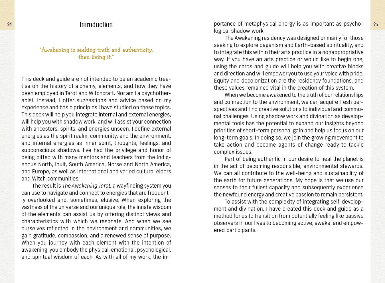 Įkvėptas Žemėje pagrįsto dvasingumo, kaladė yra veiksminga priemonė būrimui, savęs tobulėjimui ir prieigai prie paslėptų sferų. Jis vilioja skaitytoją tapti įgalintu pokyčių agentu, pažadindamas žemės, oro, ugnies, vandens, dvasios ir elementarių vadovų mokymus.