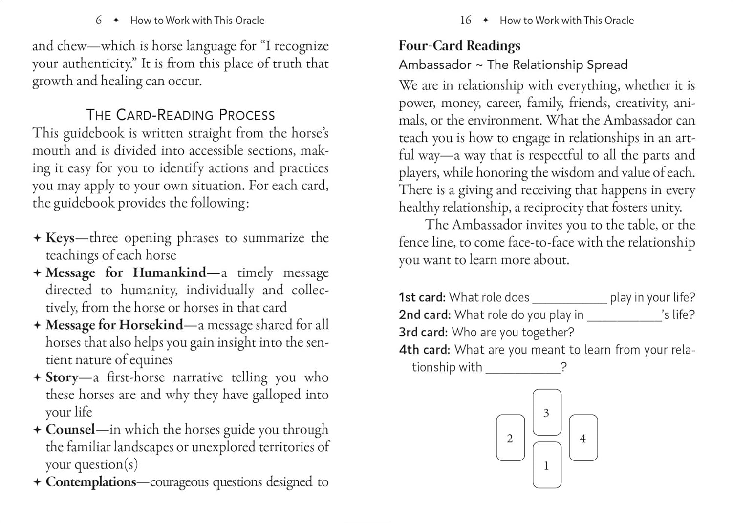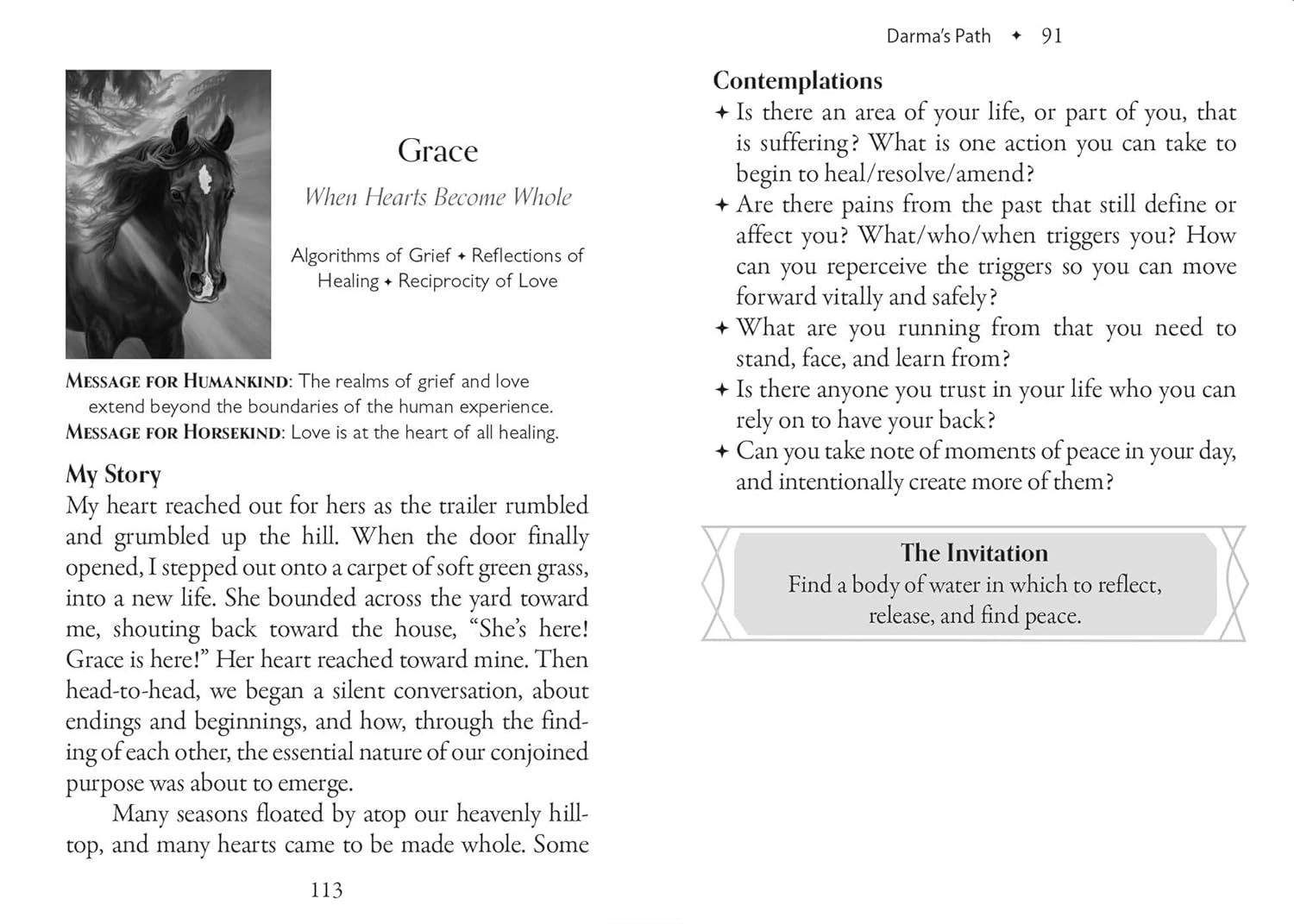 Pasitelkite dieviškąją arklių išmintį, kad gautumėte patarimų ir saviugdos. Knygoje yra 40 gražiai iliustruotų kortų, kuriose pavaizduoti arklių avatarai ir mitinės arklių būtybės, tokios kaip vienaragiai, Pegasas ir Chironas. Vadovėlyje pateikiama kiekvienos kortos žinutė, nurodymai, kurie padės nustatyti, ar einate teisingu keliu, ar jums reikia postūmio teigiama linkme, taip pat siūlomi veiksmai, padėsiantys integruoti Arklių tarybos pamokas. Šis orakulas, leidžiantis pasinaudoti žemiškąja ir dvasine arklių išmintimi, atspindi tūkstantmečius trunkantį žmonijos ryšį su arkliais kaip interaktyviais transformacijos vedliais.