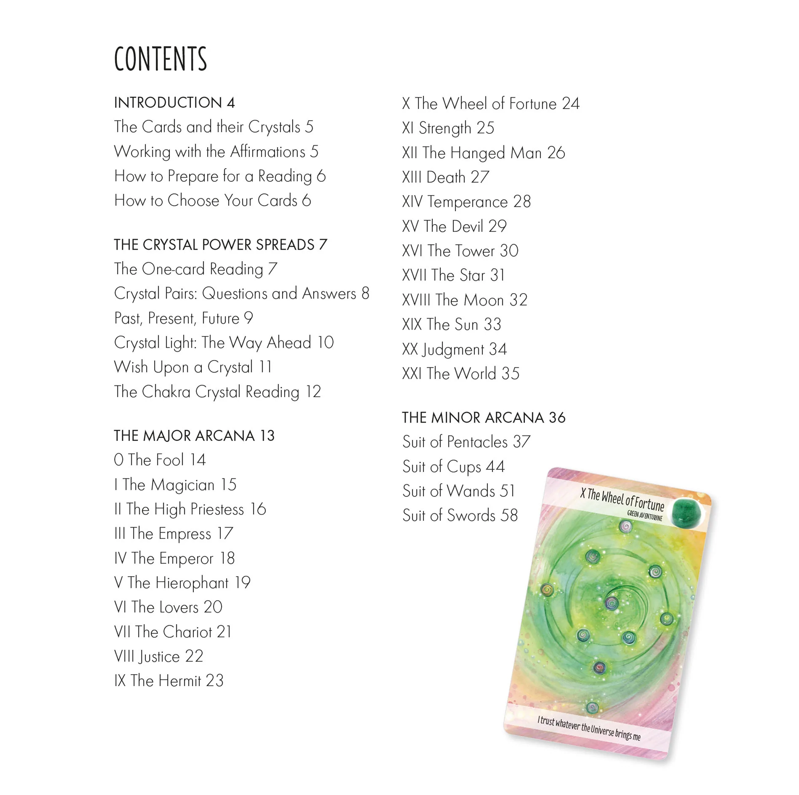 Daugelį amžių taro kortos ir kristalai buvo naudojami kaip galingi spėjimo būdai, o “The Crystal Power Tarot” juos sujungia. Visoje kaladėje yra daugiau nei trisdešimt nuostabių akmenų, o ant kiekvienos taro kortos pavaizduotas puošnus dailininko sukurtas taro paveikslas. Knygoje pateikiami visų kortų aiškinimai, jų kristalų savybės ir penkios išklotinės, kurias galima išbandyti – nuo paprastos dienos kortos iki septynių kortų čakrų išklotinės gydymui. Kiekvienoje kortelėje taip pat pateikiama įgalinimo afirmacija, kuri suteikia galimybę išreikšti savo ketinimą ir užmegzti ryšį su kortos kristalu, taip imantis veiksmų, kad paveiktumėte savo ateitį ir paverstumėte savo svajones realybe. Šis unikalus kristalų taro – nuo patarimų apie santykius iki karjeros gairių – nušviečia tai, kas jums dabar svarbu, ir suteikia priemonių, kaip įgyvendinti savo norus.