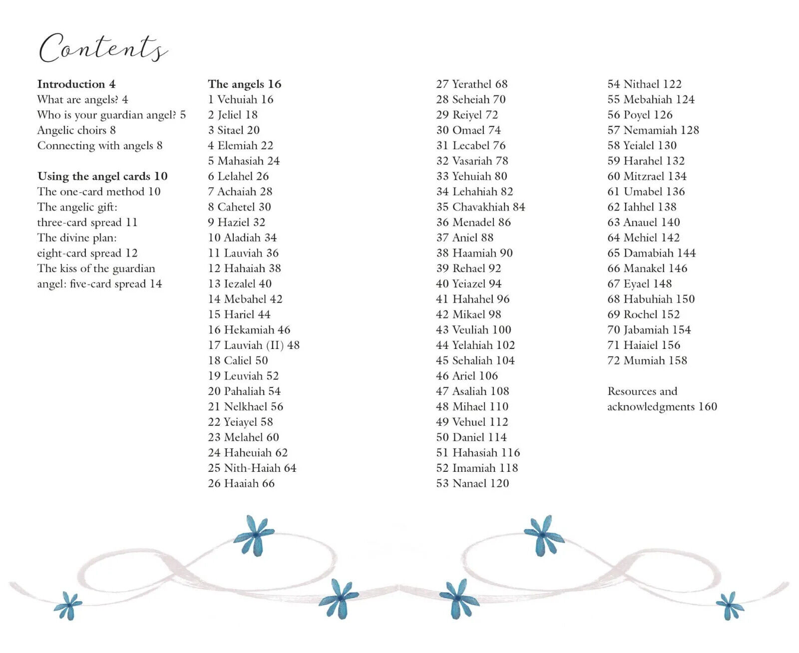 Angelai veikia kaip kanalai tarp žmonių pasaulio ir dangaus. Kiekvienas iš mūsų pagal savo gimimo datą turime angelą sargą, o mūsų charakteris, potencialas ir gyvenimas susiklostys pagal to angelo dieviškąsias savybes. Naudodamiesi šia puikia kalade, kuri pateikiama atskiroje kompaktiškoje dėžutėje, galite užmegzti ryšį su visais angelais sargais, kad rastumėte problemų sprendimus ir atskleistumėte savo gyvenimo tikslą. Vadove pateikiami keli kortų išdėstymo variantai, kuriuos galima naudoti burtams, pagalbai ir išminčiai, taip pat paaiškinamos visų 72 kaladėje esančių angelų asociacijos ir reikšmės. Kortos ir vadovas taip pat gražiai įrišti į atminimo dėžutę.