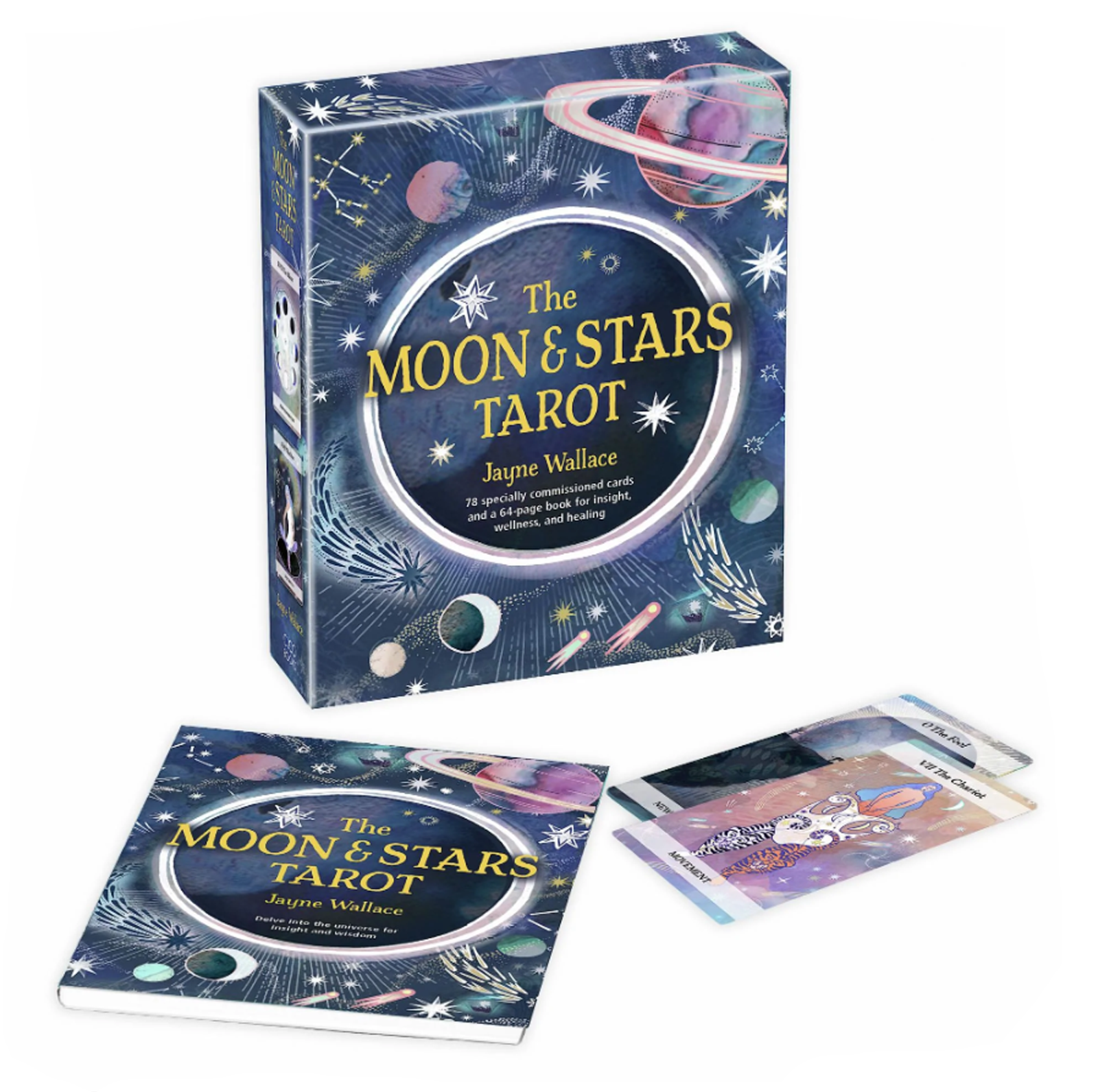 Pasinerkite į visatą ir pasisemkite įžvalgos bei išminties iš viršaus „The Moon and Stars Tarot“ – prabangioje, unikalioje 78 kortų kaladėje, įkvėptoje žvaigždynų, mėnulio ciklų, planetų ir naktinio dangaus. Išnarpliokite jums iš viršaus siunčiamus pranešimus ir patarimus, naudodami The Moon & Stars Tarot. Specialiai užsakytos iliustracijos, užpildytos išraiškingais vaizdais, padės jums suprasti pranešimus, siunčiamus iš mėnulio, žvaigždžių, planetų ir zodiako ženklų. Galėsite praturtinti ir puoselėti savo intuiciją prisijungdami prie mėnulio energijų, kartu įnešdami jėgų į savo kasdienį gyvenimą bei šviesos į savo tamsos akimirkas, kaip mėnulis daro naktį. Pridedamoje knygoje pateikiamos visų kortų interpretacijos, įskaitant raktinius žodžius, žvaigždžių žinutes ir mėnulio magišką patvirtinimą, taip pat kortų paskirstymus, kurie svyruoja nuo dienos kortos iki sudėtingesnių išdėstymų, siekiant gilesnės įžvalgos.