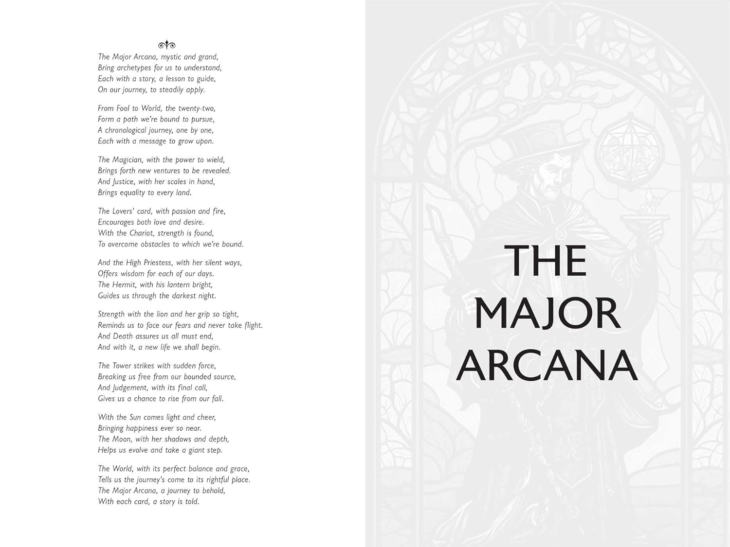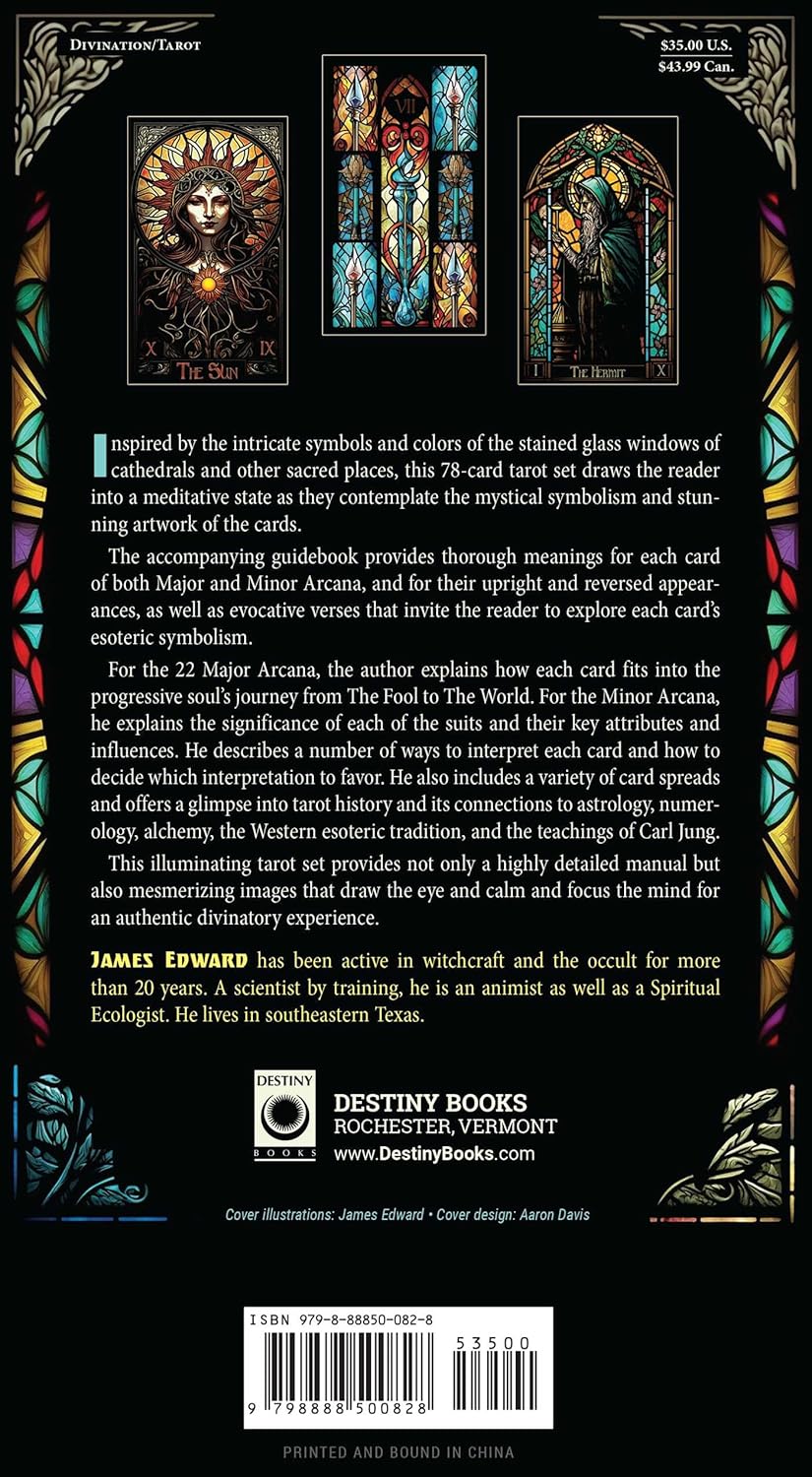 Įkvėptas sudėtingų katedrų ir kitų šventų vietų vitražų simbolių ir spalvų, šis 78 kortų taro rinkinys įtraukia skaitytoją į meditacinę būseną, kai jis apmąsto mistinę simboliką ir nuostabius meno kūrinius kortose. Pridėtame žinyne pateikiamos išsamios reikšmės kiekvienai Didžiojo ir Mažojo arkanų kortelei, taip pat jų atvirkštiniam pavidalui.
