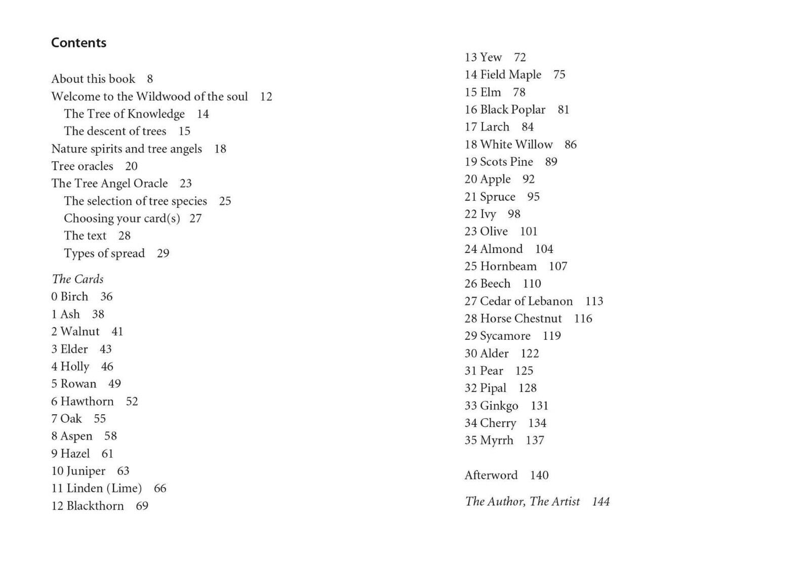 Šiame orakulo kortų ir knygos rinkinyje Fredas Hagenederis dalijasi giliomis žinutėmis ir išmintimi, kurią perduoda Medžių angelai iš 36 skirtingų medžių rūšių – tų, kurie yra iš senosios keltų “Medžių abėcėlės”, ir kitų gerai žinomų medžių iš viso pasaulio. Kiekvienoje spalvotoje kortoje, iliustruotoje dailininkės Anne Heng, vaizduojamas konkretus medis ir jo angelas, atskleidžiantis medžius kaip unikalias būtybes, pasižyminčias individualia energija ir spindesiu. Vadove, remiantis botanikos ir istorijos šaltiniais bei didele autorės patirtimi dirbant su medžių angelais, aiškinama, kaip interpretuoti kiekvienos medžių angelų kortos žinutę ir kaip naudoti jas. Pateikiami šie medžiai: Jame pateikiami šie angelai: beržas, uosis, graikinis riešutas, šeivamedis, juodalksnis, riešutmedis, šeivamedis, liepa, kukmedis, klevas, uosis, juodoji tuopa, maumedis, baltasis gluosnis, paprastoji pušis, obelis, eglė, gebenė, alyva, migdolas, šermukšnis, bukas, Libano kedras, paprastasis kaštonas, platanas, alksnis, kriaušė, pipalas, ginkmedis, vyšnia ir mira.