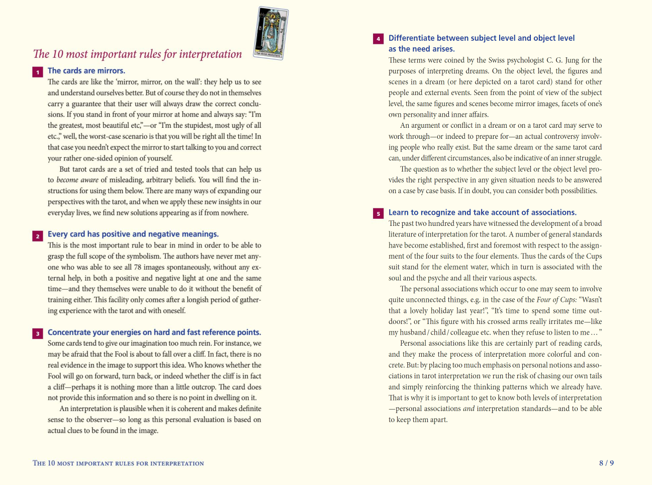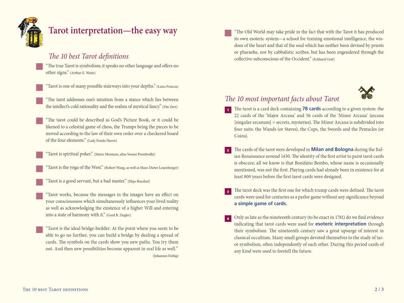 Atraskite viską, ką kada nors norėjote sužinoti apie populiariausią pasaulyje taro kaladę. „Ultimate Guide to the Rider Waite Tarot“ išsamiai aprašo dešimt svarbiausių simbolių kiekvienoje kortoje, kartu su šimtais iliustracijų, kad būtų lengva naudotis. Be simbolių paaiškinimo, kiekviena korta trumpai interpretuojama pagal temas: Pirminė reikšmė; prognozė ar tendencija; dvasinė prasmė; meilės ir santykių prasmė; dienos reikšmė; Sėkmės ir laimės prasmė .Rašydami patogiu formatu, skirtu greitoms nuorodoms, Europos tarologai Johannesas Fiebigas ir Evelin Bürger taip pat pateikia patarimų, užuominų, faktų ir žinių, kaip iš karto pagerinti jūsų skaitymą. Šiuose puslapiuose rasite dešimt svarbiausių: vienos kortelės naudojimo būdai; patarimai ir aiškinimo taisyklės; faktai apie taro; Interpretacijos kiekvienam kostiumui; skleisti maketavimo būdus.