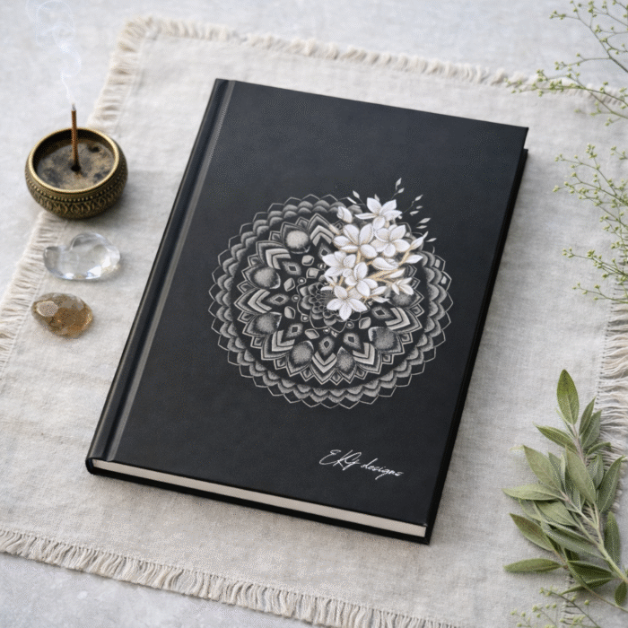 Juoda, matinė užrašų knygutė su mandala kviečia sustoti ir įsiklausyti. Tai vieta mintims, kurios neskuba: tyliai gimstančioms idėjoms, jausmams, svajonėms.