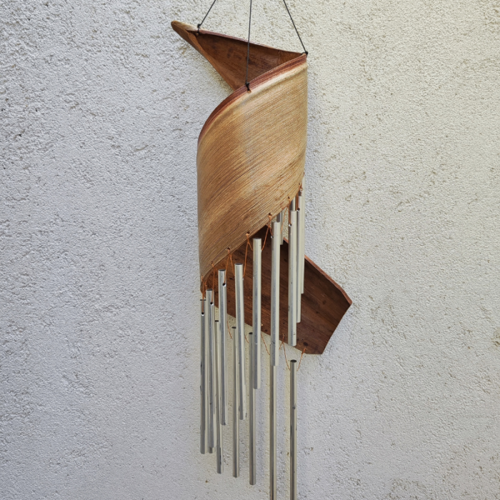 Vėjo varpeliai pagaminti iš natūralaus sudžiovinto kokoso lapo bei metalinių lazdelių.