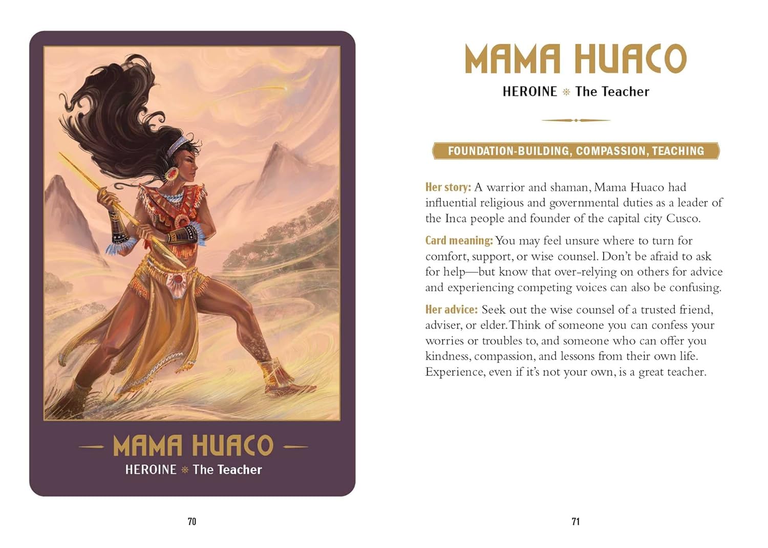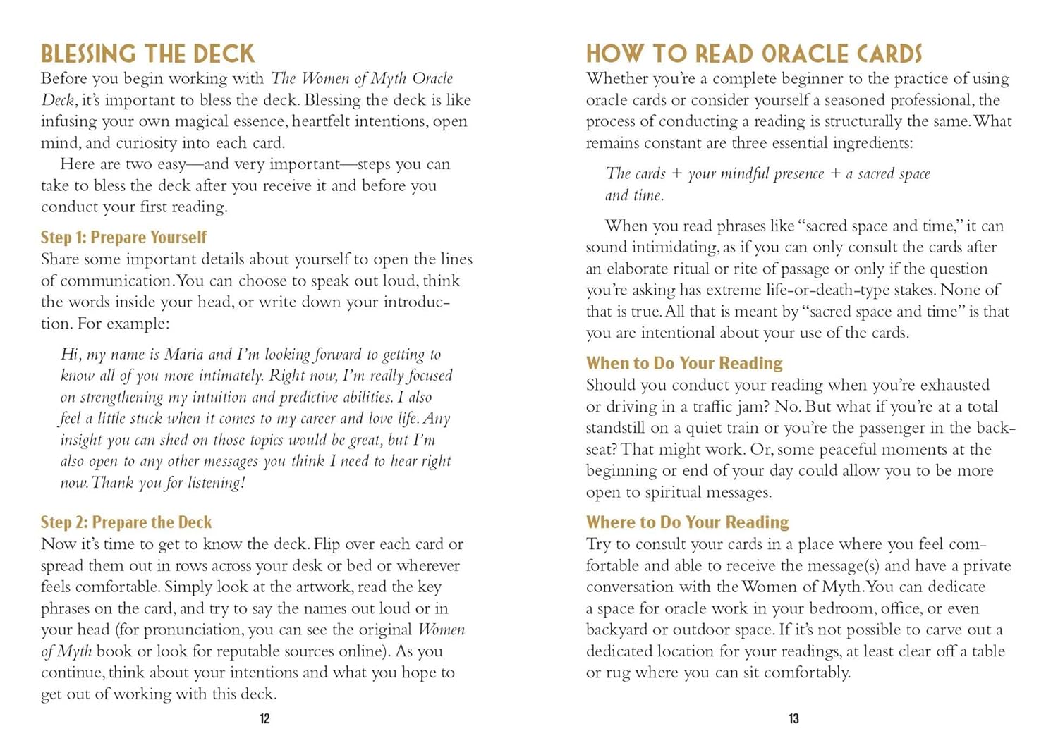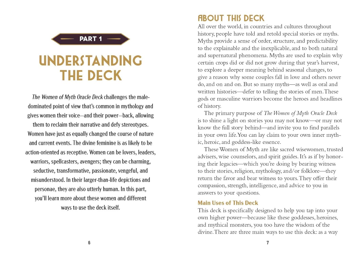 “Women of Myth Oracle” – tai daug galios suteikianti kaladė, kurioje galite pasikonsultuoti su 50 mitinių moterų išmintimi, kurių kiekviena pasakoja jaudinančias istorijas apie triumfą, tragediją, pergalę, širdį veriančią netektį, o neretai ir apie viską tarp jų. Ši kaladė buvo sukurta siekiant perimti šių moterų pamokas, patarimus, išmintį ir simboliką ir perduoti juos į jūsų rankas. Ši kaladė yra galingas įrankis intuicijai, savęs pažinimui ir ryšiui su dieviškuoju moteriškumu palaikyti.