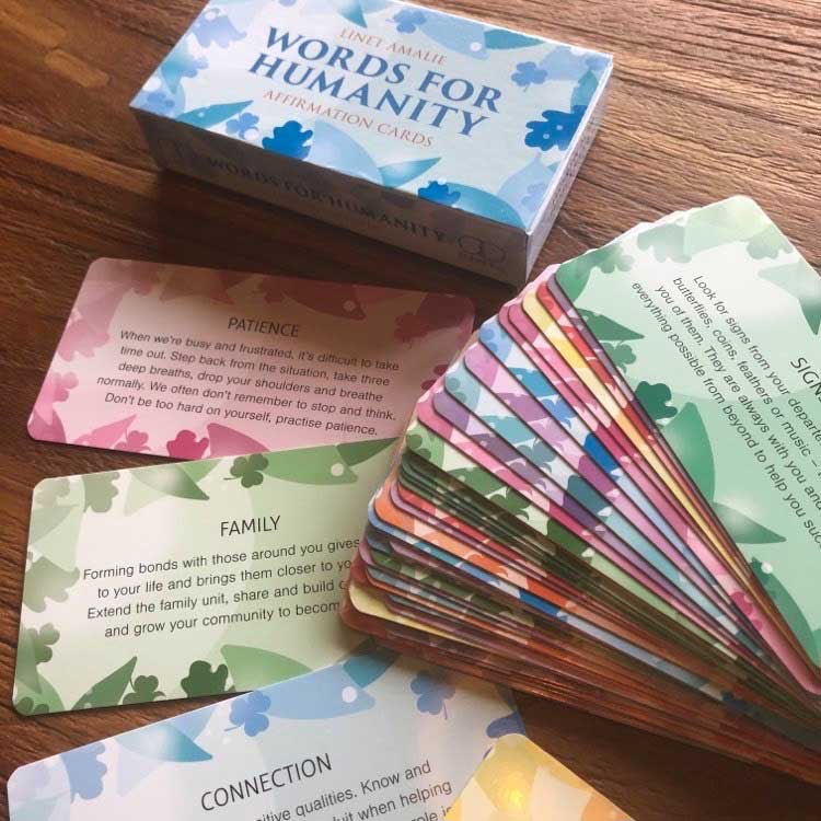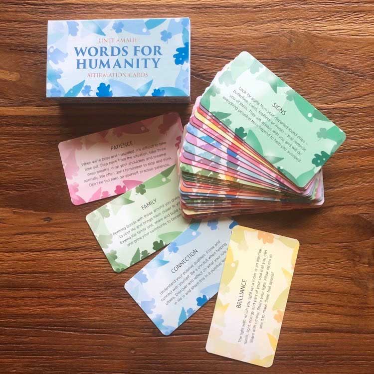 “Words fr Humanity” – tai 50 afirmacijų kortelių, kurios įkvėps ir paskatins eiti pirmyn įvairiuose gyvenimo etapuose. Autorė Dr. Linet Amalie dirbo sveikatos, savigydos ir terapijos srityse daugiau nei 30 metų. Per šį ilgą laiką sukaupta patirtis leido sukurti šį puikų įrankį, kuriame gausu naudingos išminties. Kortos gali būti naudojamos kasdienėms afirmacijoms ar pagal poreikį. Dr. Linet perteikia žinutes su gerumu, atjauta bei empatija.